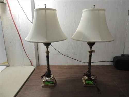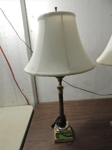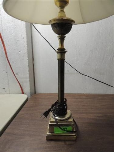 VINTAGE PAIR STIFFEL SILVER PLATED EMPIRE STYLE LIBRARY LAMPS. WITH SHADES. 29"T. AS SHOWN. VIEW PICTURE FOR DETAIL.