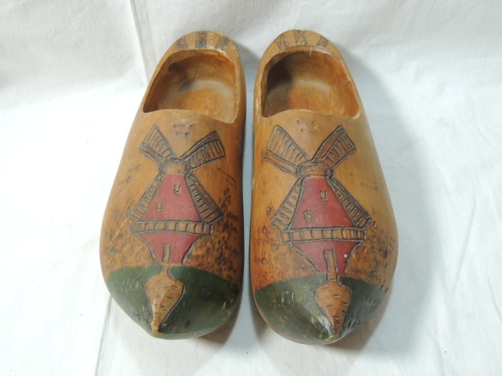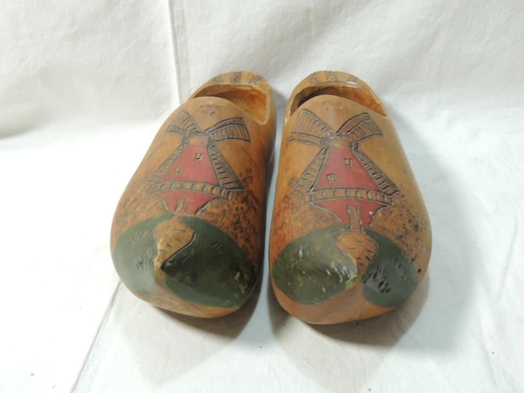 VINTAGE PAIR WOODEN CLOGS. WINDMILL DESIGN. CARVED. AS SHOWN. SEE PHOTO FOR MORE DETAILS.