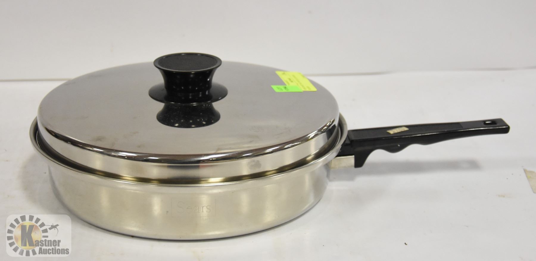 VINTAGE PAN WITH LID FROM SEARS 10 3/4" **ALL ITEMS MUST BE REMOVED BY 5PM MONDAY, AUGUST 1ST, 2022. ALL REMAINING ITEMS WILL BE SUBJECT TO A $6.00 PER DAY STORAGE CHARGE. ANY ITEMS REMAINING AFTER MONDAY, AUGUST 15, 2022 WILL BE CONSIDERED FORFEITED. NO REFUNDS WILL BE ISSUED FOR FORFEITED ITEMS.** TO SCHEDULE A PICK UP APPOINTMENT CLICK HERE