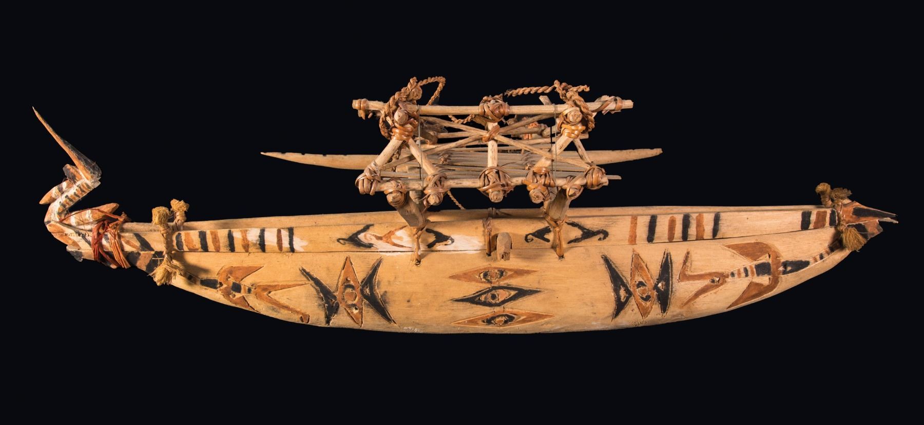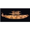 (1960s) A very well carved model of an outrigger canoe, most probably from Humboldt Bay, Papua New Guinea. Some wear and possible missing elements. 7"x23"x17". VG+ with typical wear.