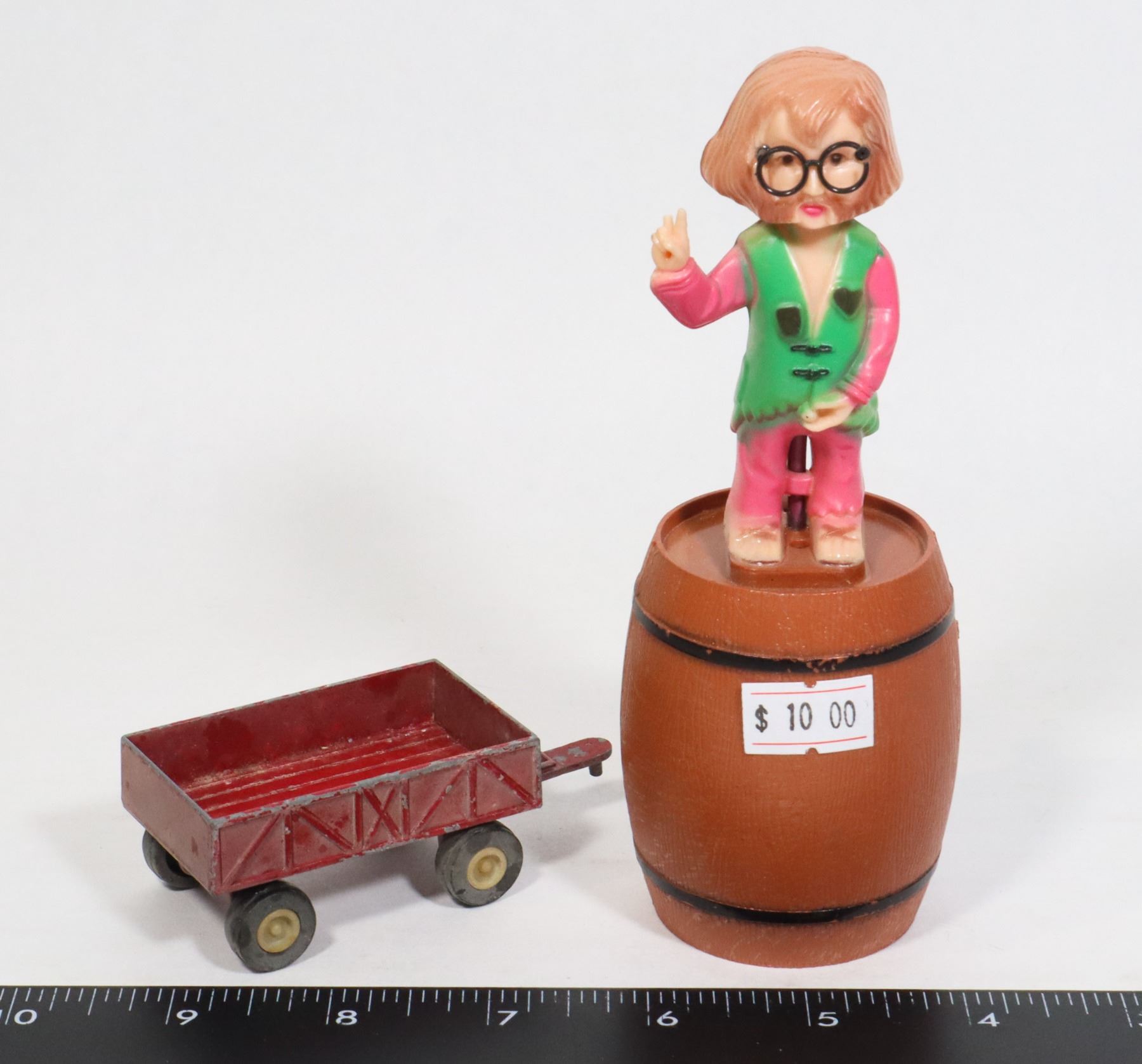 SOME DAMAGE TO GLASSES. SUPPOSED TO SQUIRT WATER, UNTESTED. SOLD WITH VINTAGE TOOTSIETOY FARM TRAILER
