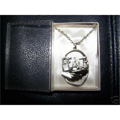 Original Vintage 1960's Peace Symbol Necklace Holding Hands - still in it's original box, never worn! The chain is 24" in length. It also has an add'l link attached to wear as a bracelet also. <p> The Peace symbol is large measuring approximately 1 1/4" x 1 1/4". Silvertone Link chain. Original box included. I cannot find who the maker is. This is from an Estate and is about 40+/- years old.<p>