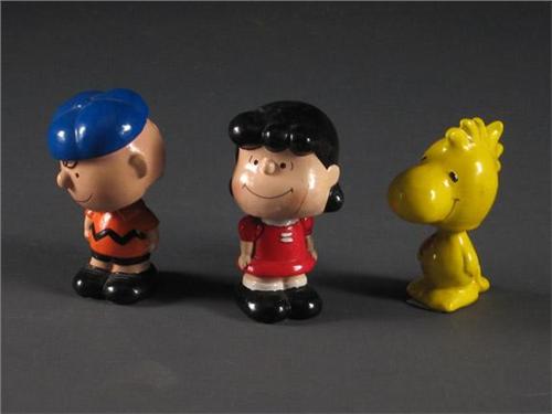 Three ''Peanuts'' plaster bobbleheads with metal spring mechanisms to include Woodstock, Lucy and Charlie Brown (wearing an incongruous blue hat). All made post-1972, Lucy shows a repair to her face and cracks to the back of head; Charlie Brown's head is