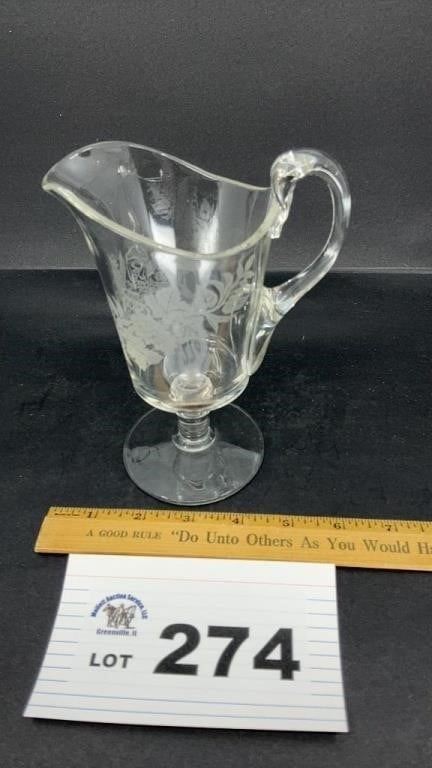 VINTAGE PEDESTAL CREAMER PITCHER, ETCHED 7 i