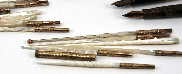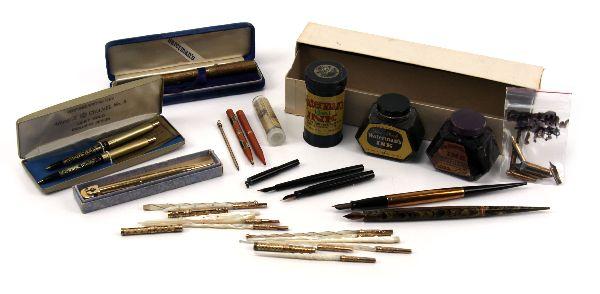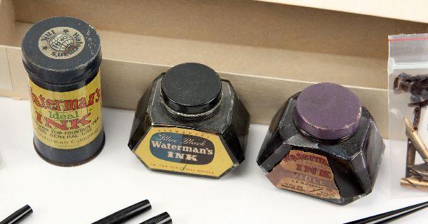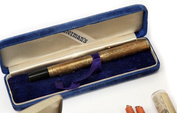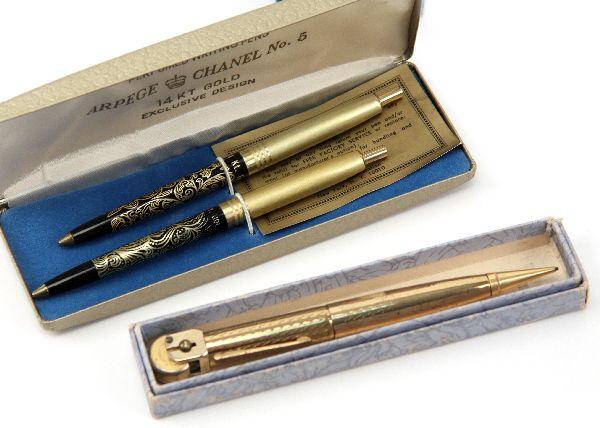 Grouping includes: Arpege Channel No. 5, 14K gold filigree perfumed writing pen set, (2) Waterman desk fountain pens with levers, an Ideal Yellow Ripple, an Ideal with gold filled band (both missing bladder), an Ideal 52 gold filled filigree banding with