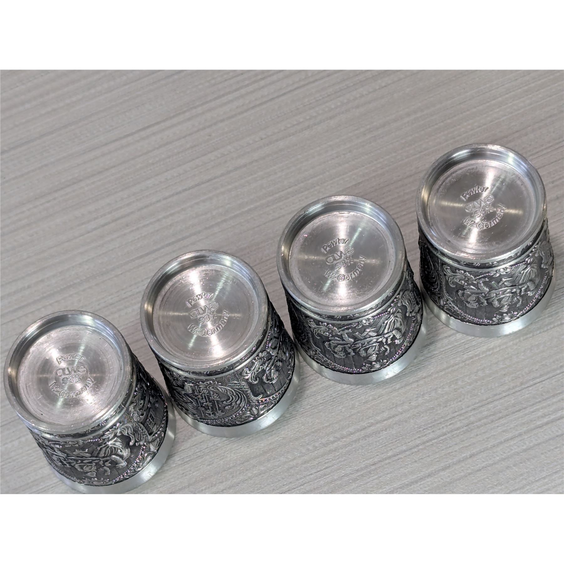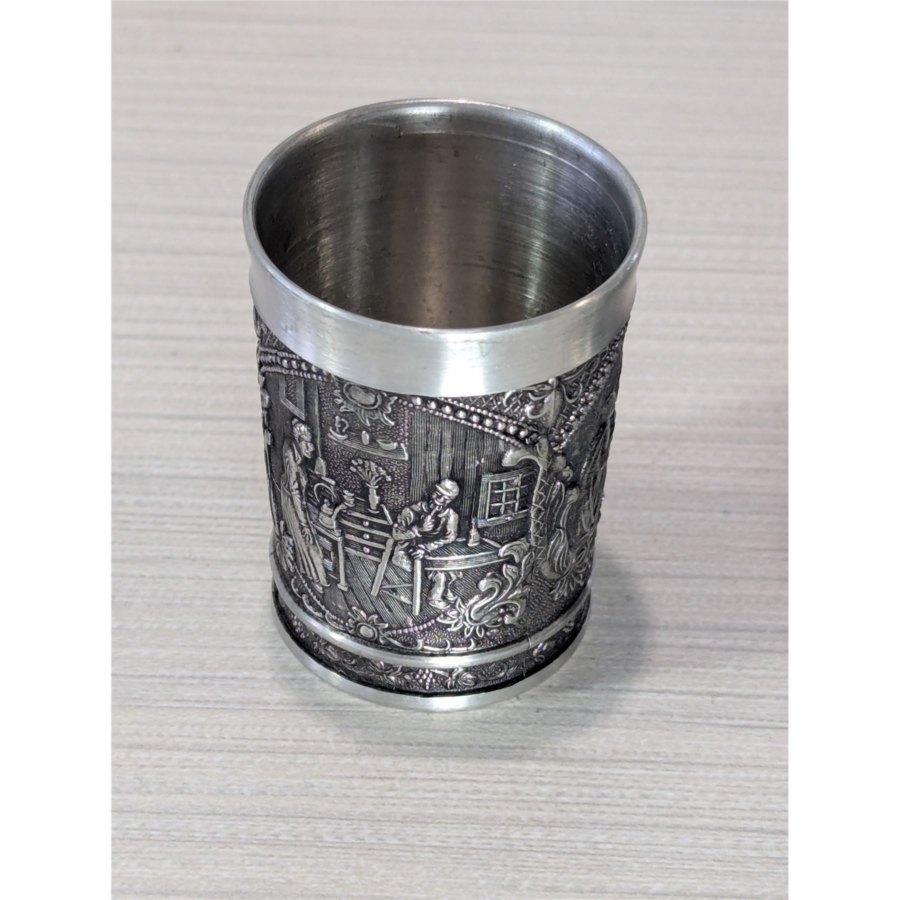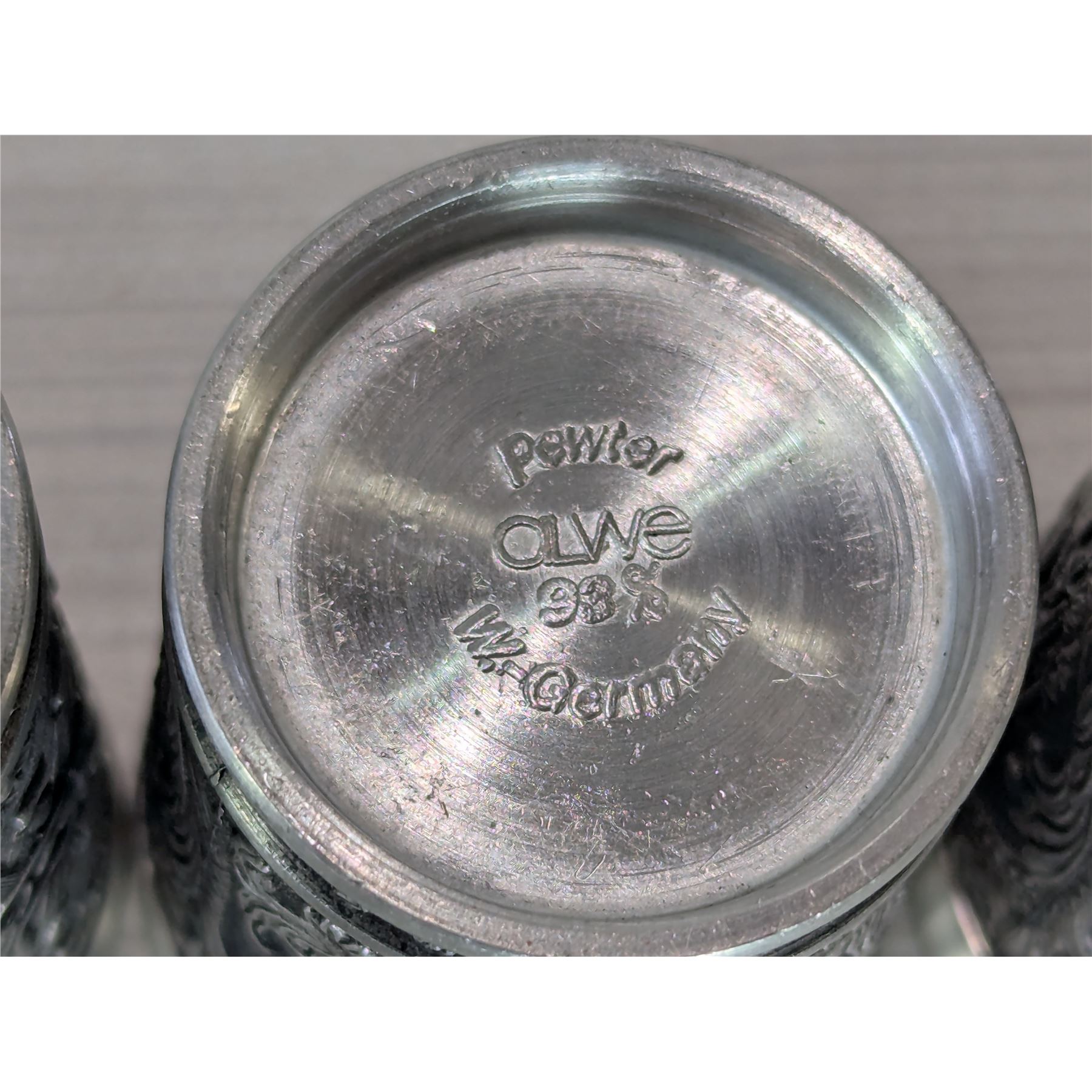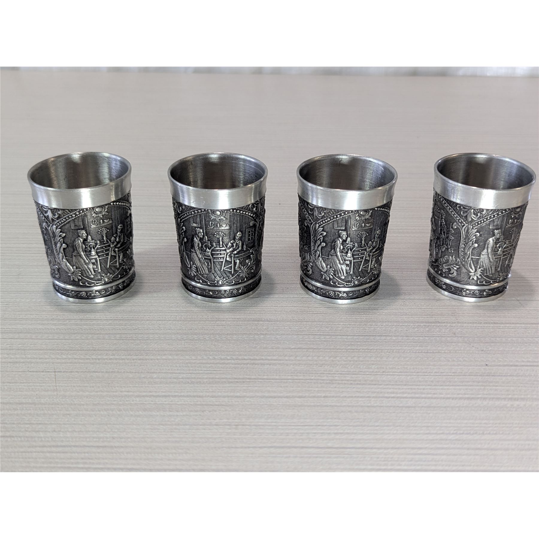 VINTAGE PEWTER SCHNAPPS SHOT GLASSES made in West Germany. Each tankard depicts three scenes.