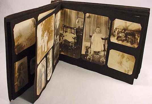 VINTAGE PHOTO ALBUM W/ PHOTOS - Incl. Babies in Wicker Baby Carriages, Livestock, People on A Railroad Track Riding Device, Horses, Boating, Old Cars, Military Men in Front of Train Car, More! Album Approx. Half Full