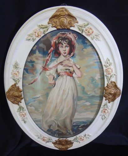 VINTAGE PICTURE AND FRAME. PICTURE GLASS IS DOME GLASS WHICH IS HARD TO FIND. THE OVAL FRAME IS HAND PAINTED. THE WOOD IS CRACKING WITH AGE STAINS. Est Value $99.00-120.00