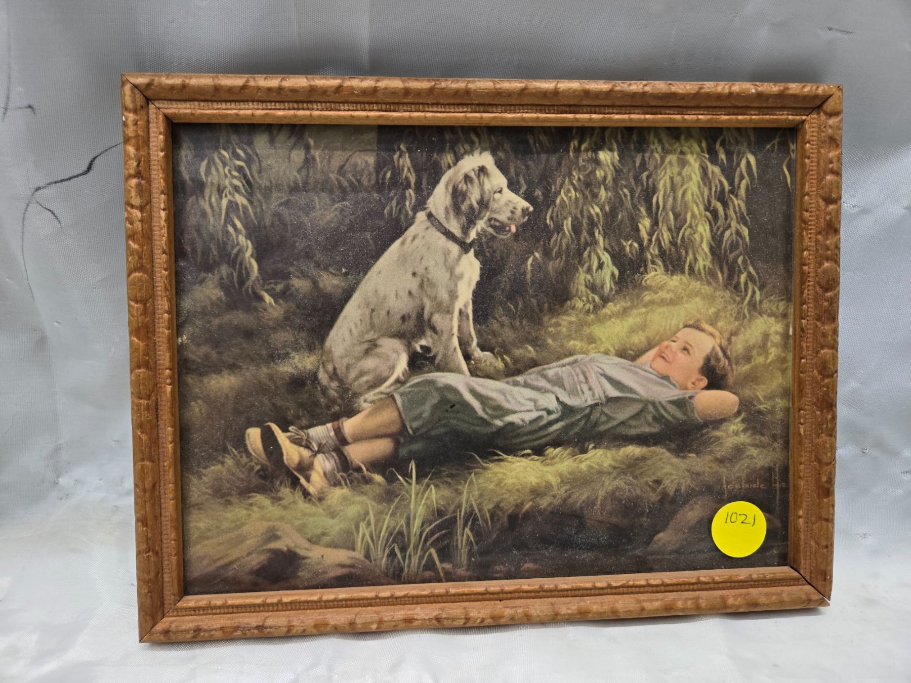 VINTAGE PICTURE WITH BOY & DOG 7" X 9"