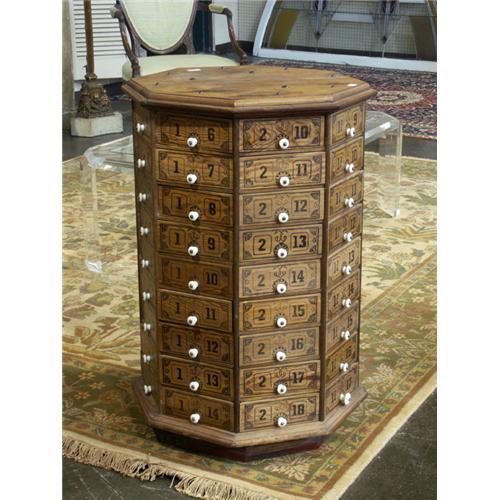 SEWING BUTTON CABINET: Vintage pine sewing button cabinet, octogan shape, 72 numbered drawers. 32h x 21''d x 21''w