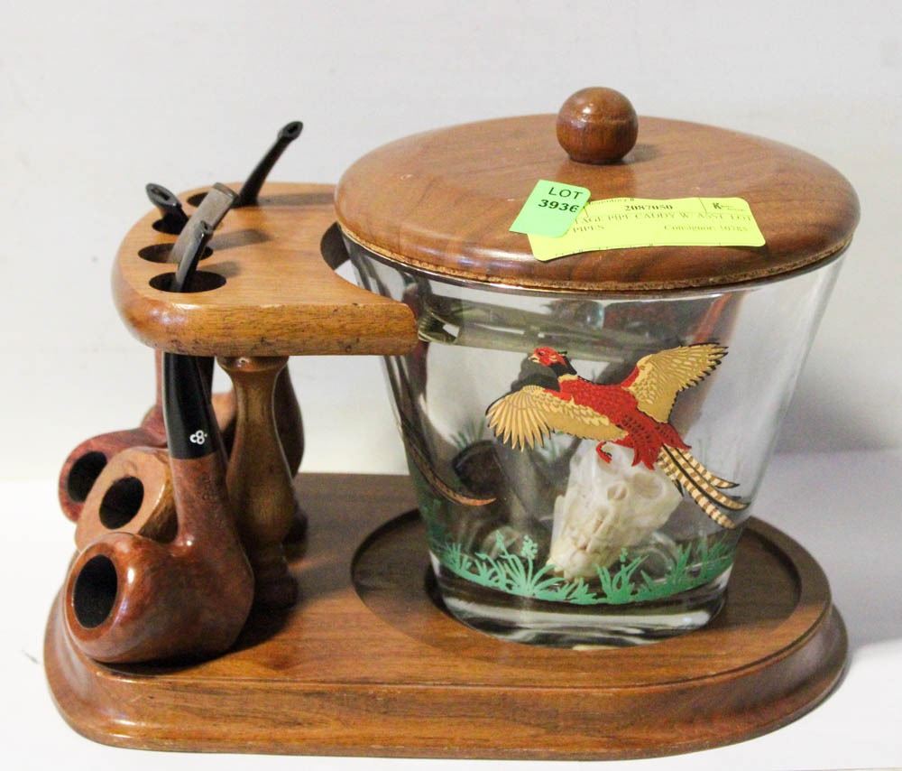 VINTAGE PIPE CADDY W/ ASST. LOT OF PIPES