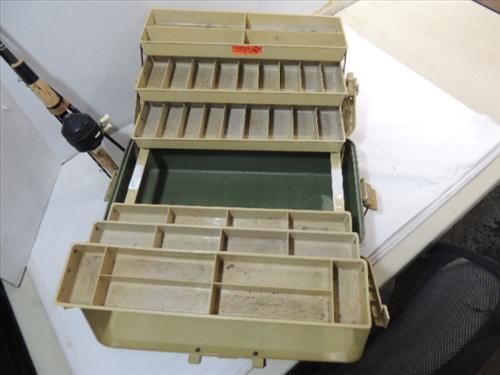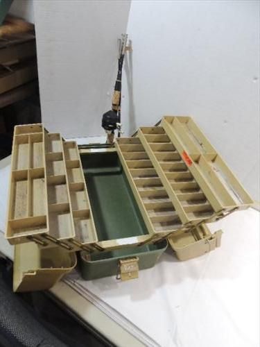 VINTAGE PLANO 8600 FISHING TACKLE BOX & ZEBCO ROD, REEL. AS SHOWN. VIEW PICTURE FOR DETAIL.