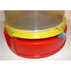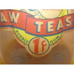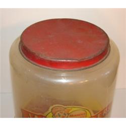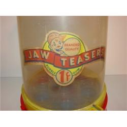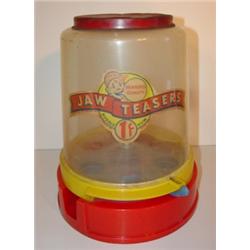 VINTAGE PLASTIC BUBBLE GUM DISPENSER. Label reads “Jaw Teasears-Bubble Gum-1¢-Gum Products Inc.-Boston, Mass”. Tin lid shows signs of rusting and denting. Plastic container shows signs of scratching. 12” H