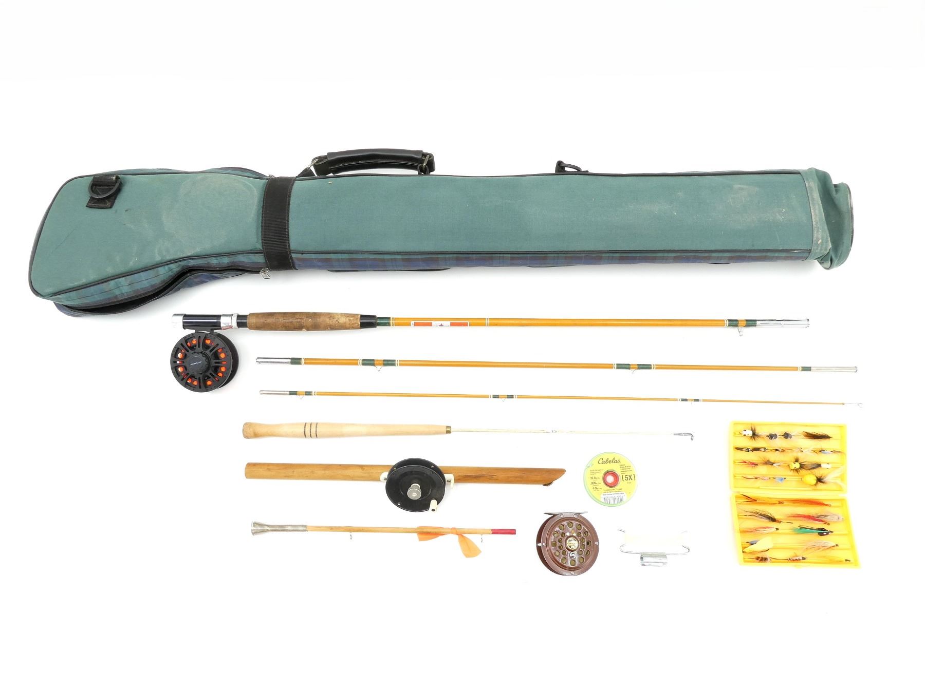 LOT INCLUDES; (1) 3-PIECE ROD, MARKED "NO. 77-4522", WITH FAIRPLAY REEL ATTACHED, IN PROTECTIVE CASE WITH ZIPPER CLOSURE & CARRY HANDLE, (1) COMPAC 25 REEL, (1) CABELA'S FRESHWATER TIPPET, SIZE 5X, 4.9LB (2.2KG) TEST, (1) COMPAC CASE WITH ASSORTED FLIES & (2) ICE FISHING RODS, VARIOUS MAKERS, UNTESTED, MAY BE INCOMPLETE OR MISSING PARTS, ETC. SEE PHOTOS.