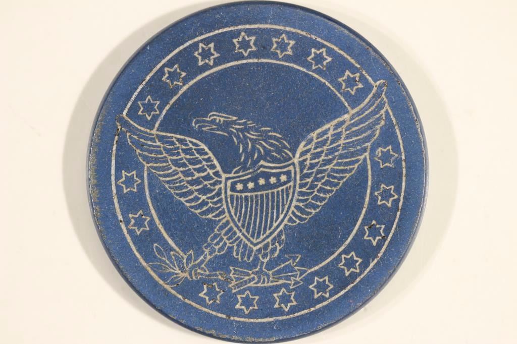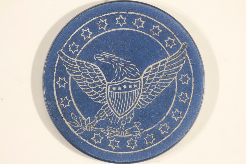 VINTAGE POKER CHIP BLUE/WHITE WITH ENGRAVED EAGLE