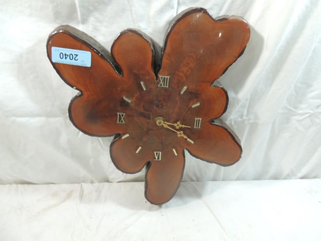DECORATIVE POLISHED WOOD SLICE WALL CLOCK, DECORATIVE CLOCK, DESIGNER CLOCK, VINTAGE CLOCK, DECTAILED 1950s-70s CLOCK AS SHOWN SEE PHOTO FOR MORE DETAILS.