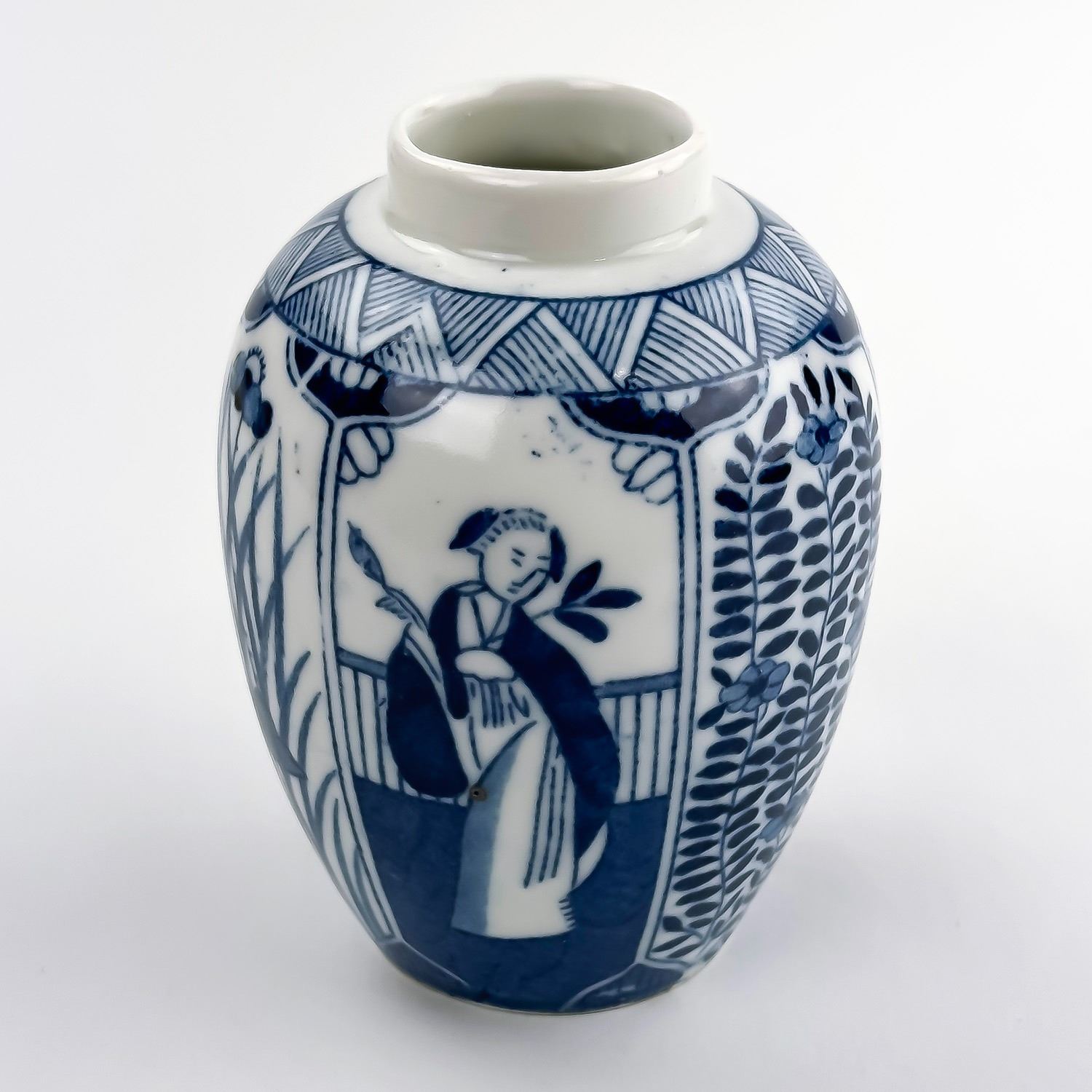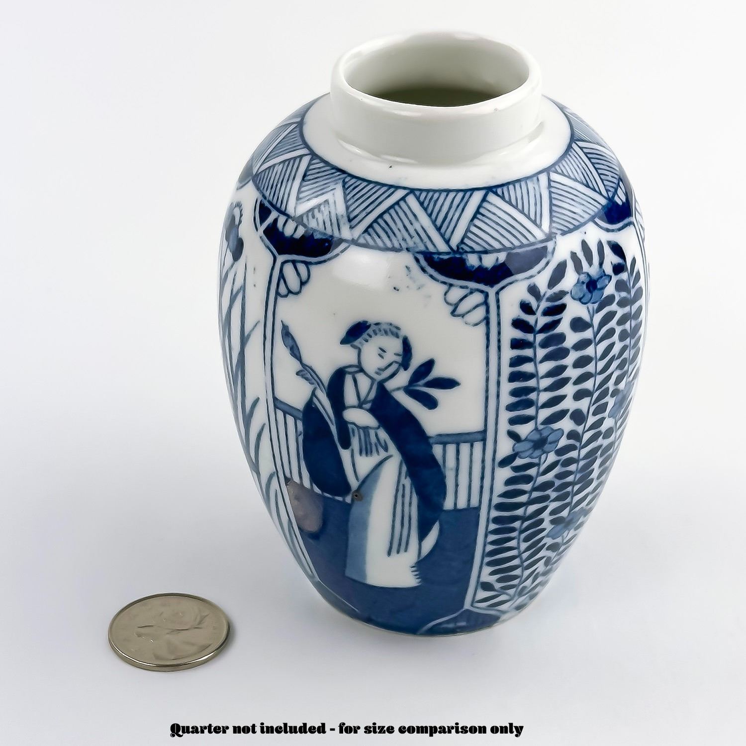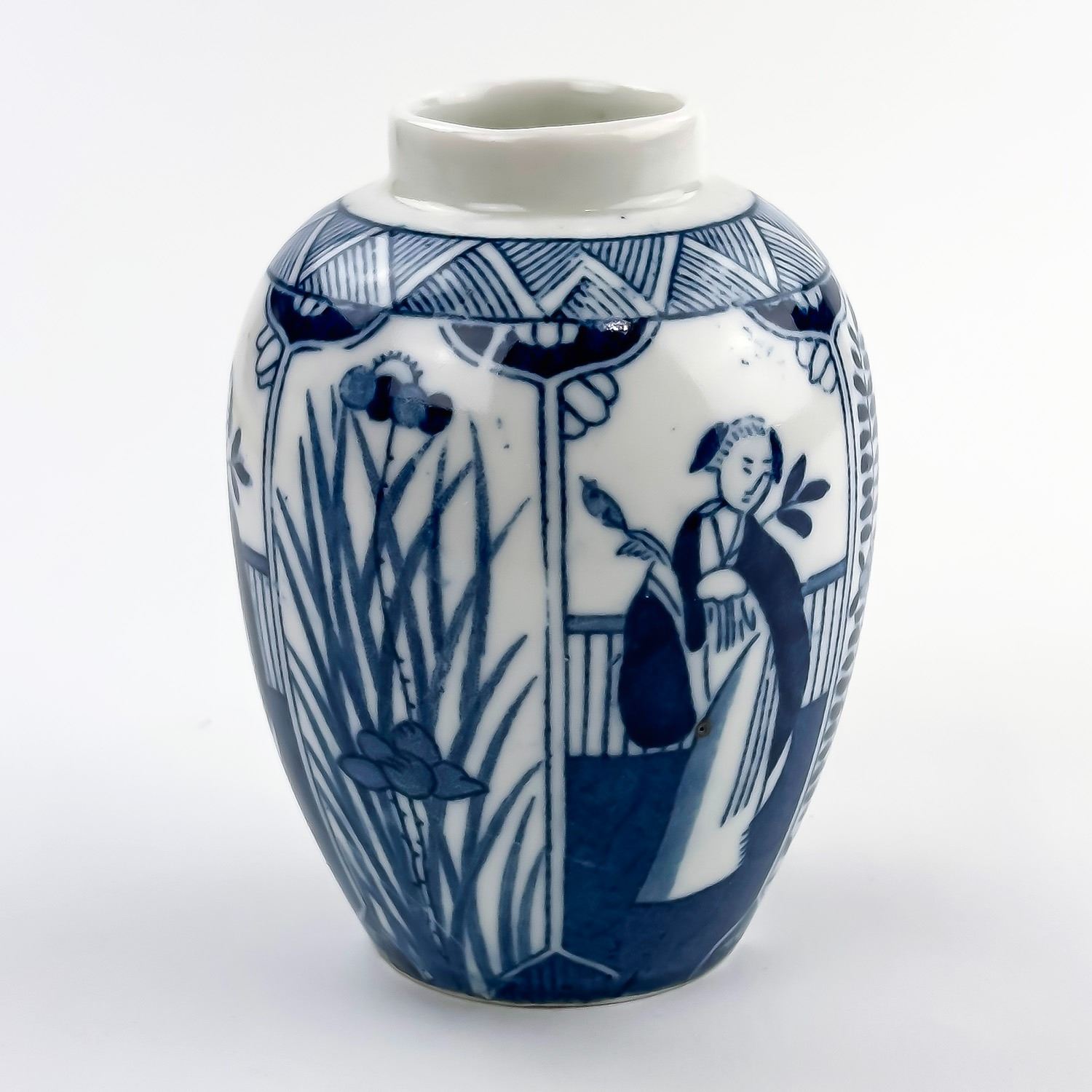 #8372 - I BELIEVE THIS UNMARKED MINIATURE VASE IS MOSA MAASTRICHT PORCELAIN - LANGE LIJS (LONG ELISA) DESIGN - DECOR 206. VINTAGE BLUE & WHITE STYLE DELFT DELFTWARE - I BELIEVE MADE IN HOLLAND - DUTCH. SOLD AS A SMALL FLOWER OR BUD VASE. NO CRACKS, CHIPS OR REPAIRS. MEASURES: 4.25” (11 CM) TALL BY ROUGHLY 3.125” (8 CM) WIDEST DIAMETER