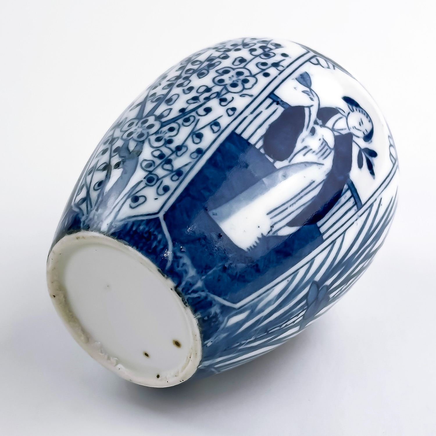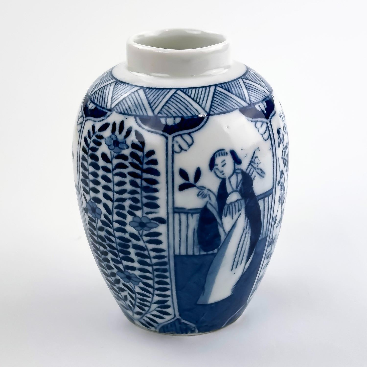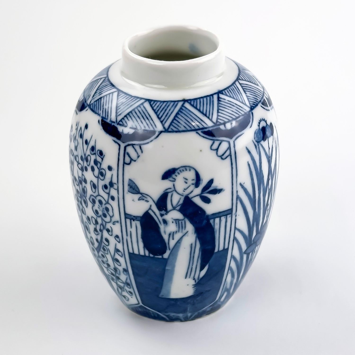 #8372 - I BELIEVE THIS UNMARKED MINIATURE VASE IS MOSA MAASTRICHT PORCELAIN - LANGE LIJS (LONG ELISA) DESIGN - DECOR 206. VINTAGE BLUE & WHITE STYLE DELFT DELFTWARE - I BELIEVE MADE IN HOLLAND - DUTCH. SOLD AS A SMALL FLOWER OR BUD VASE. NO CRACKS, CHIPS OR REPAIRS. MEASURES: 4.25” (11 CM) TALL BY ROUGHLY 3.125” (8 CM) WIDEST DIAMETER