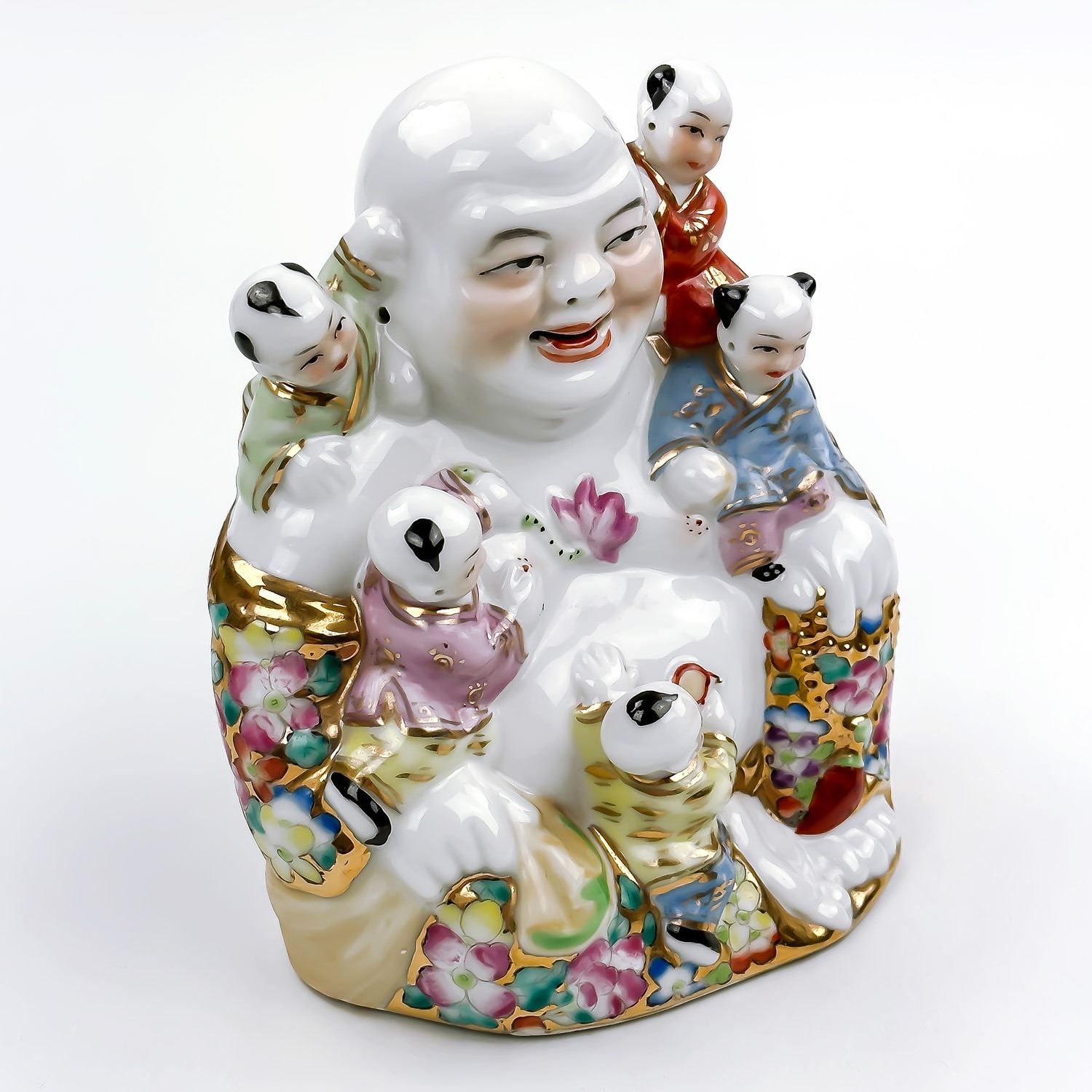 #8026 - VINTAGE PORCELAIN LAUGHING BUDDHA WITH FIVE KIDS FIGURINE. NO CRACKS, CHIPS OR REPAIRS. MEASURES: 5.5” (14 CM) TALL BY 5” (12.5 CM) WIDE AND 3.125” (8 CM) DEEP.***ITEM(S) LOCATED IN LETHBRIDGE ALBERTA. FREE TRANSPORT TO EDMONTON OFFICE AVAILABLE FOR THIS AUCTION. WORLDWIDE SHIPPING IS AVAILABLE FOR ALL ITEMS