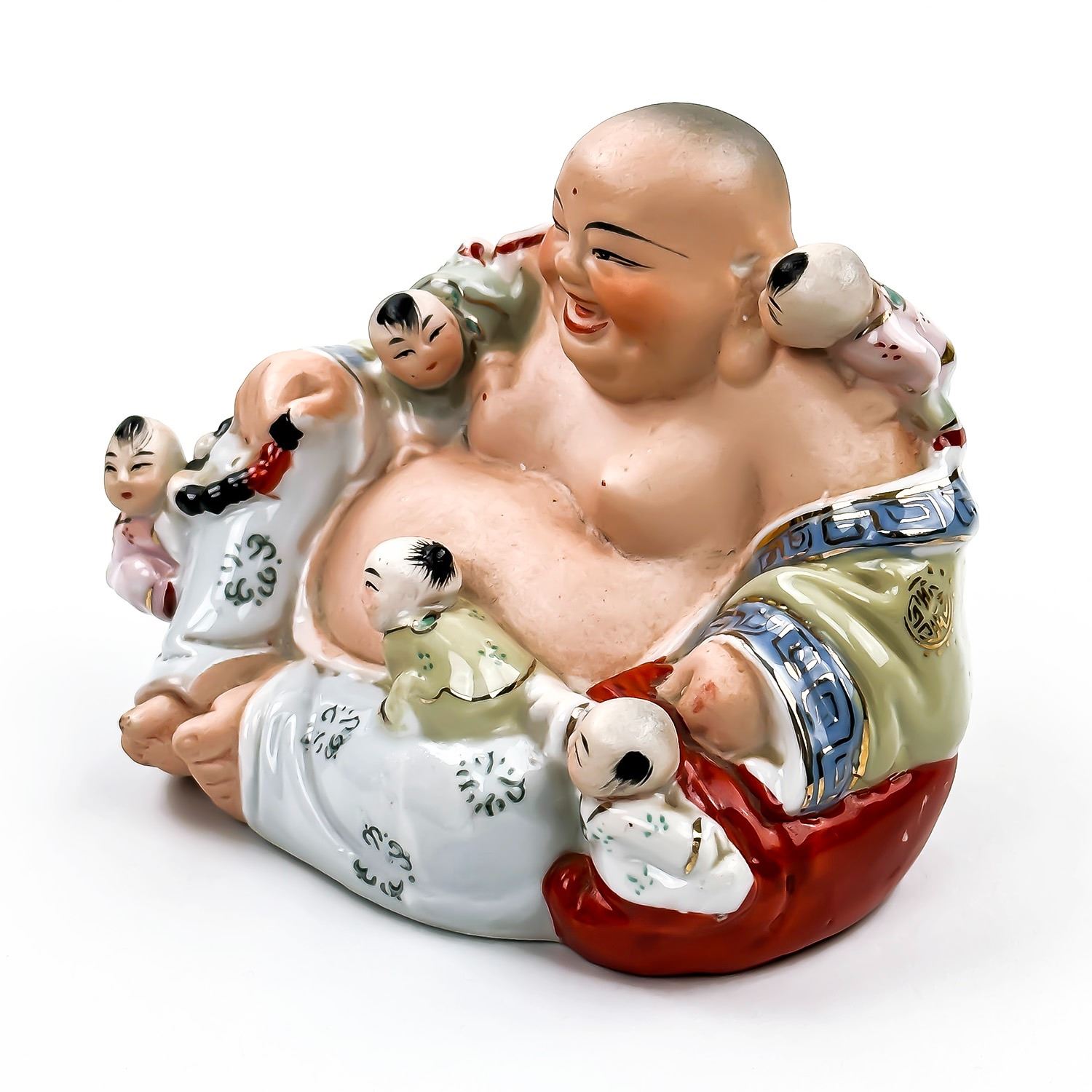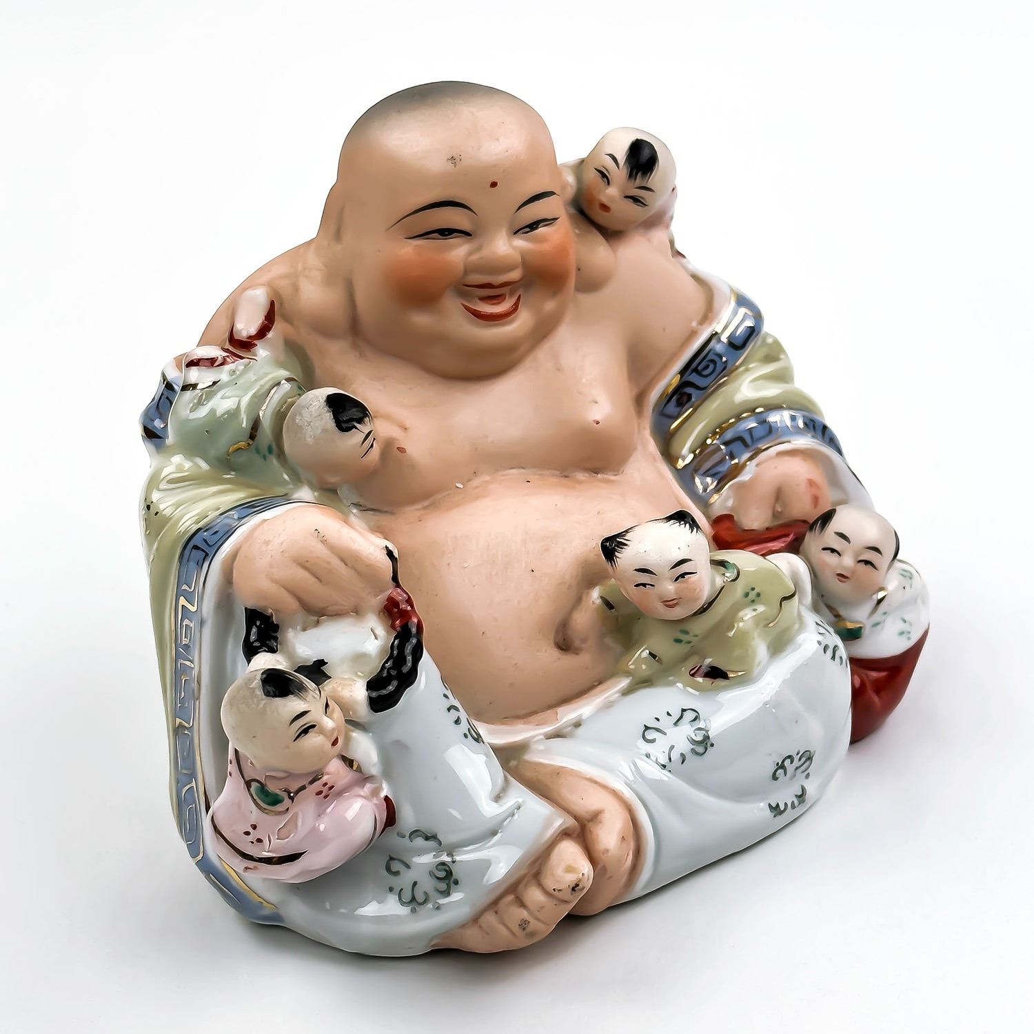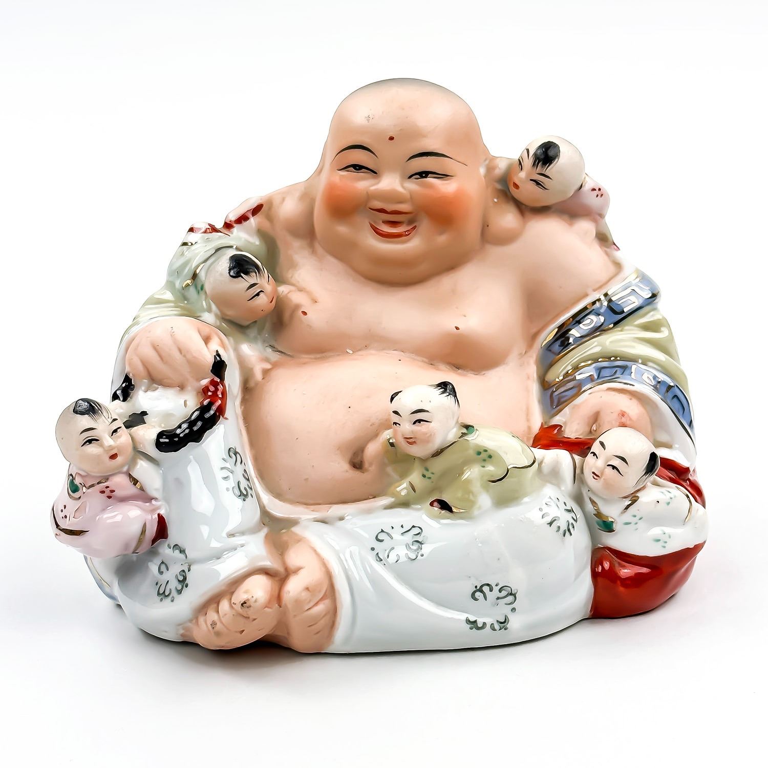 #8054 - VINTAGE PORCELAIN LAUGHING BUDDHA WITH FIVE KIDS FIGURINE. NO CRACKS, CHIPS OR REPAIRS. MEASURES: 4.5” (11.5 CM) TALL BY 6.25” (16 CM) WIDE AND 4.5” (11.5 CM) DEEP.***ITEM(S) LOCATED IN LETHBRIDGE ALBERTA. FREE TRANSPORT TO EDMONTON OFFICE AVAILABLE FOR THIS AUCTION. WORLDWIDE SHIPPING IS AVAILABLE FOR ALL ITEMS
