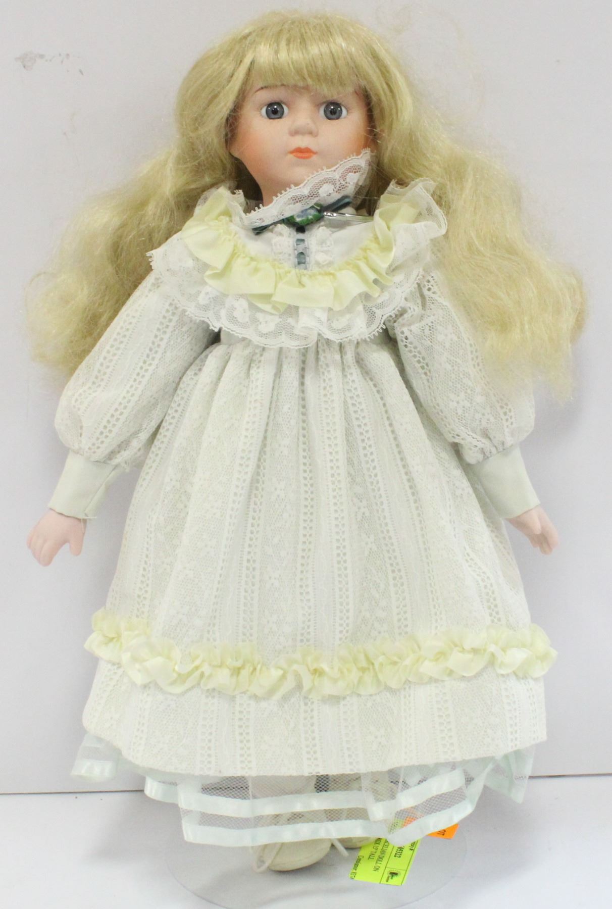 VINTAGE PORCELIAN DOLL ON STAND APPROX 15" TALL