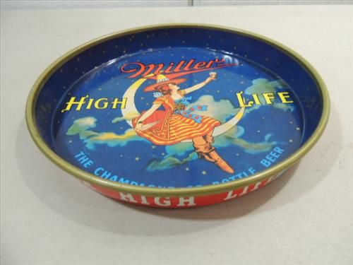 VINTAGE 12"D PRESS METAL BREWERIANA MILLER HIGH LIFE BEER SERVING TRAY. AS SHOWN. VIEW PICTURE FOR DETAIL.