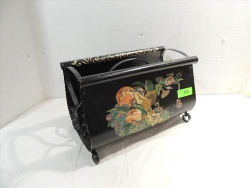 VINTAGE PRESSED METAL MAGAZINE RACK HAND PAINTED. FOLK ART TOLE WARE STYLE. AS SHOWN. VIEW PICTURE FOR DETAIL.