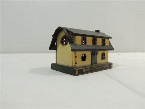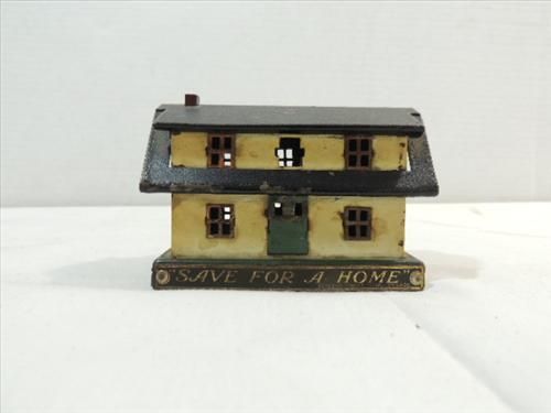 VINTAGE PRESSED METAL SAVE FOR A HOME COIN BANK: PEOPLES AND MERCHANTS STATE BANK OF PARK RIDGE. AS SHOWN. VIEW PICTURE FOR DETAI.