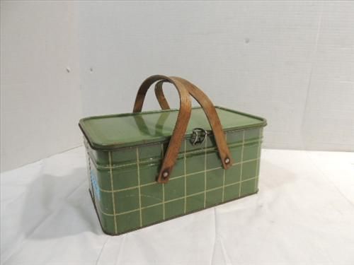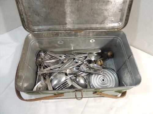VINTAGE PRESSED METAL WOOD HANDLE BASKET LOTS OF STAINLESS STEEL FLATWARE. AS SHOWN. VIEW PICTURE FOR DETAIL.