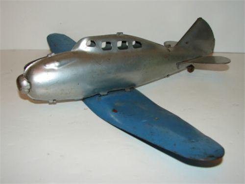 VINTAGE PRESSED STEEL TOY AIRPLANE. Shows minor loss to paint. Rear wing is stamped “Made in U.S.A.”. 10.25” L