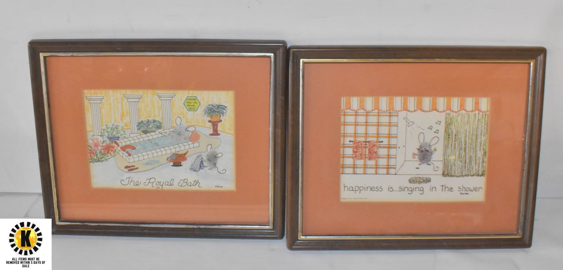 SPECTOR COORDINATING SET OF COLLECTIBLE PRINTS EDITIONS CALLED LITTLE CREATURES INC. BY ARTIST DIANNE SPECTOR. HAPPINESS IS SINGING IN THE SHOWER AND THE ROYAL BATH