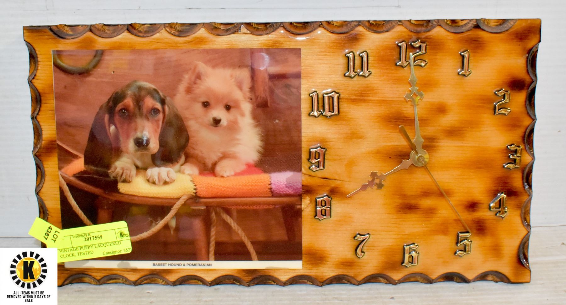 VINTAGE PUPPY LACQUERED CLOCK, TESTED