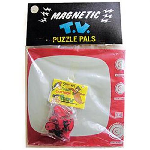Consisting of a 7-1/2? metal ?T.V.? packaged with a Hanna-Barbera magnetic plastic jigsaw puzzle figurine featuring Huckleberry Hound, Quick Draw McGraw, or Yogi Bear. A very low-tech toy from the past, dated 1963. Please specify the character you prefer.
