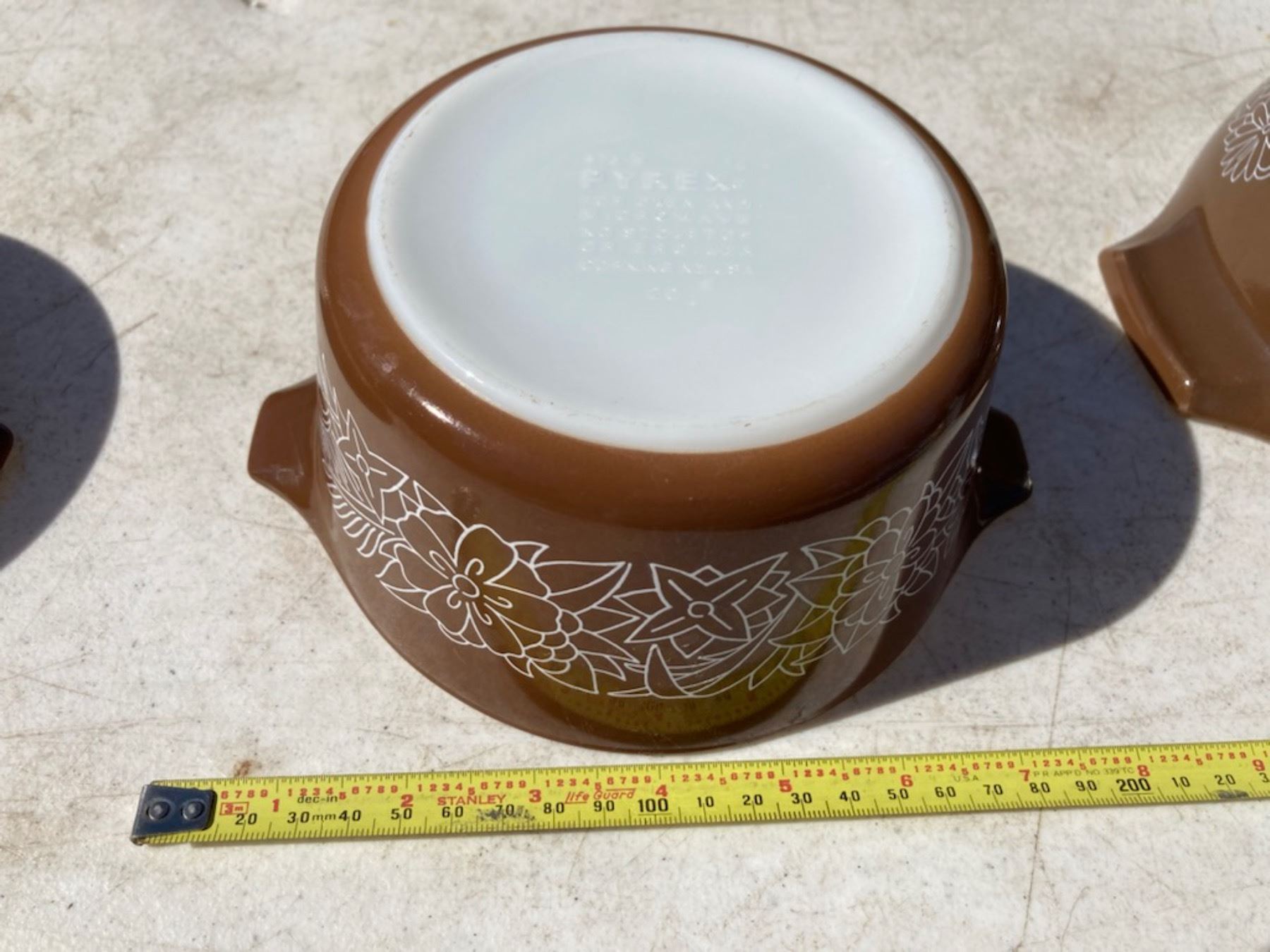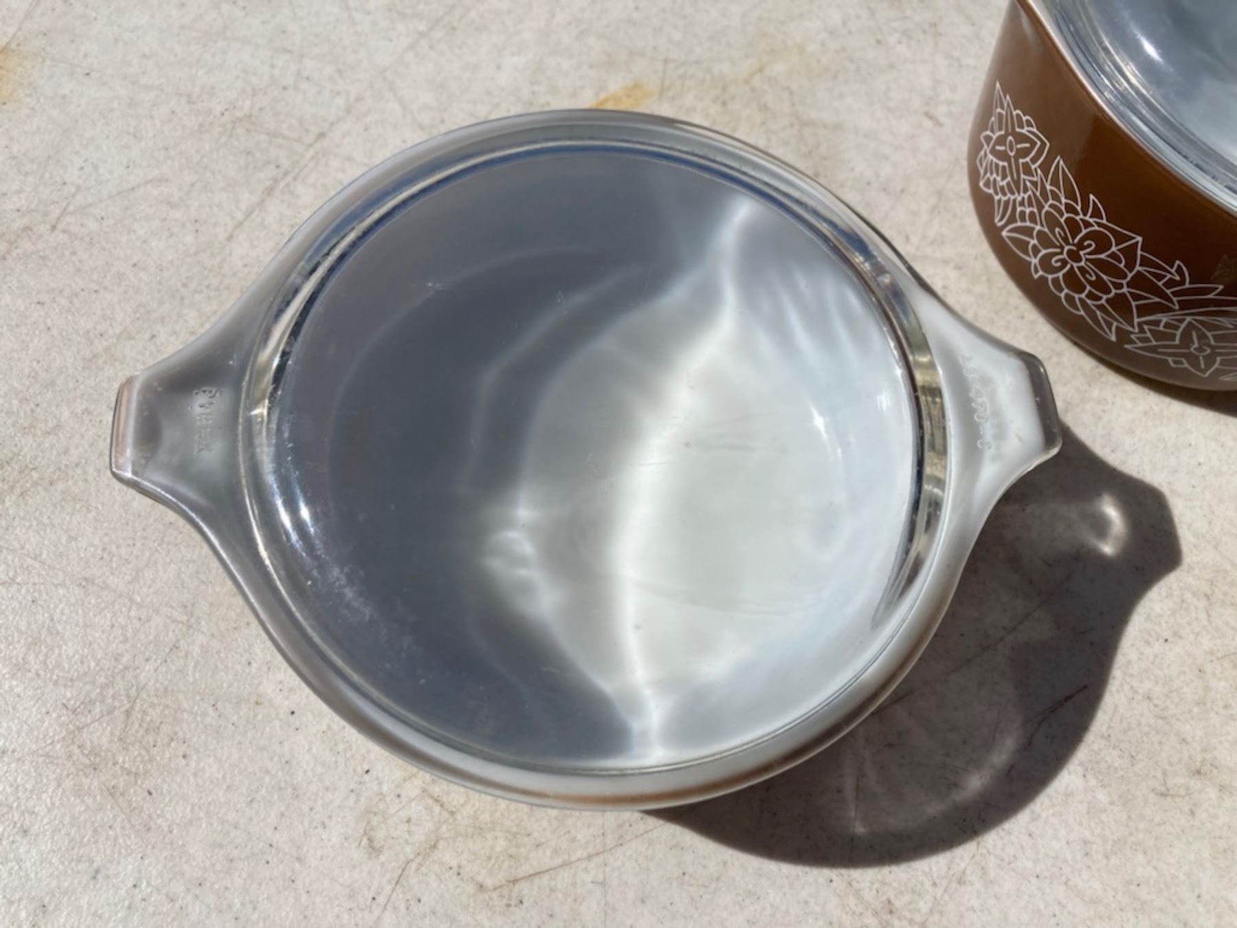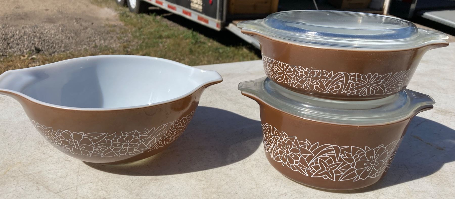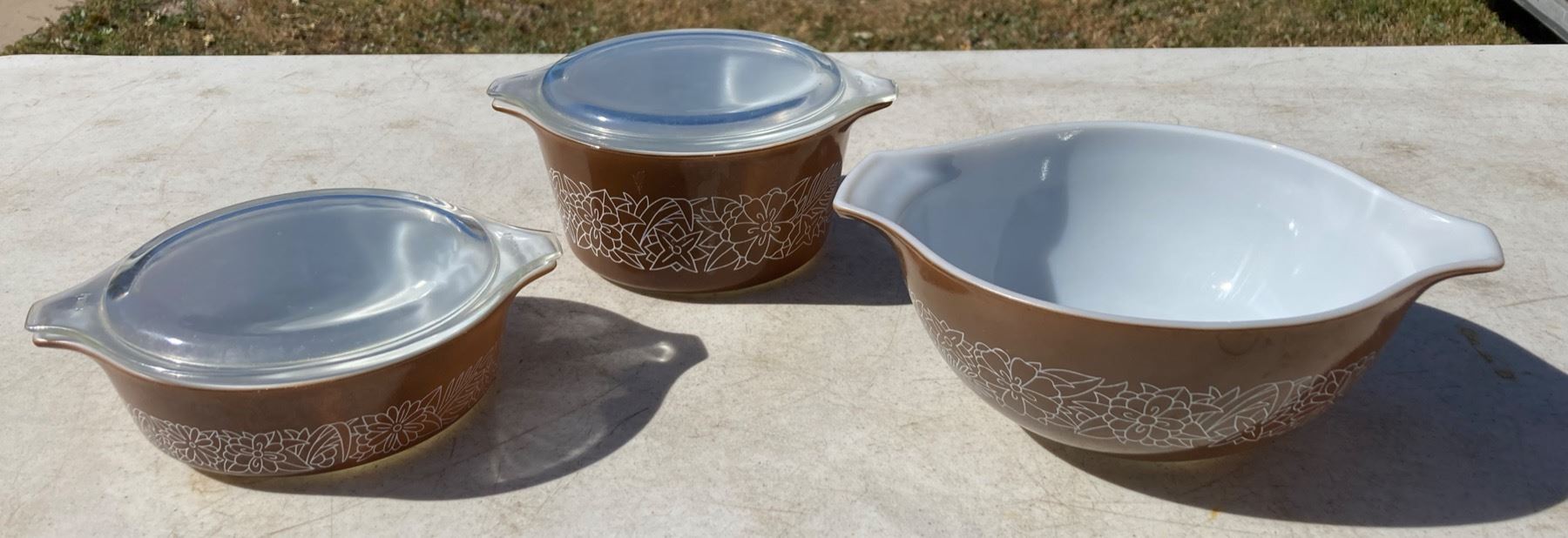 VINTAGE PYREX WOODLAND PATTERN BOWLS, LOT OF THREE WITH TWO LIDS