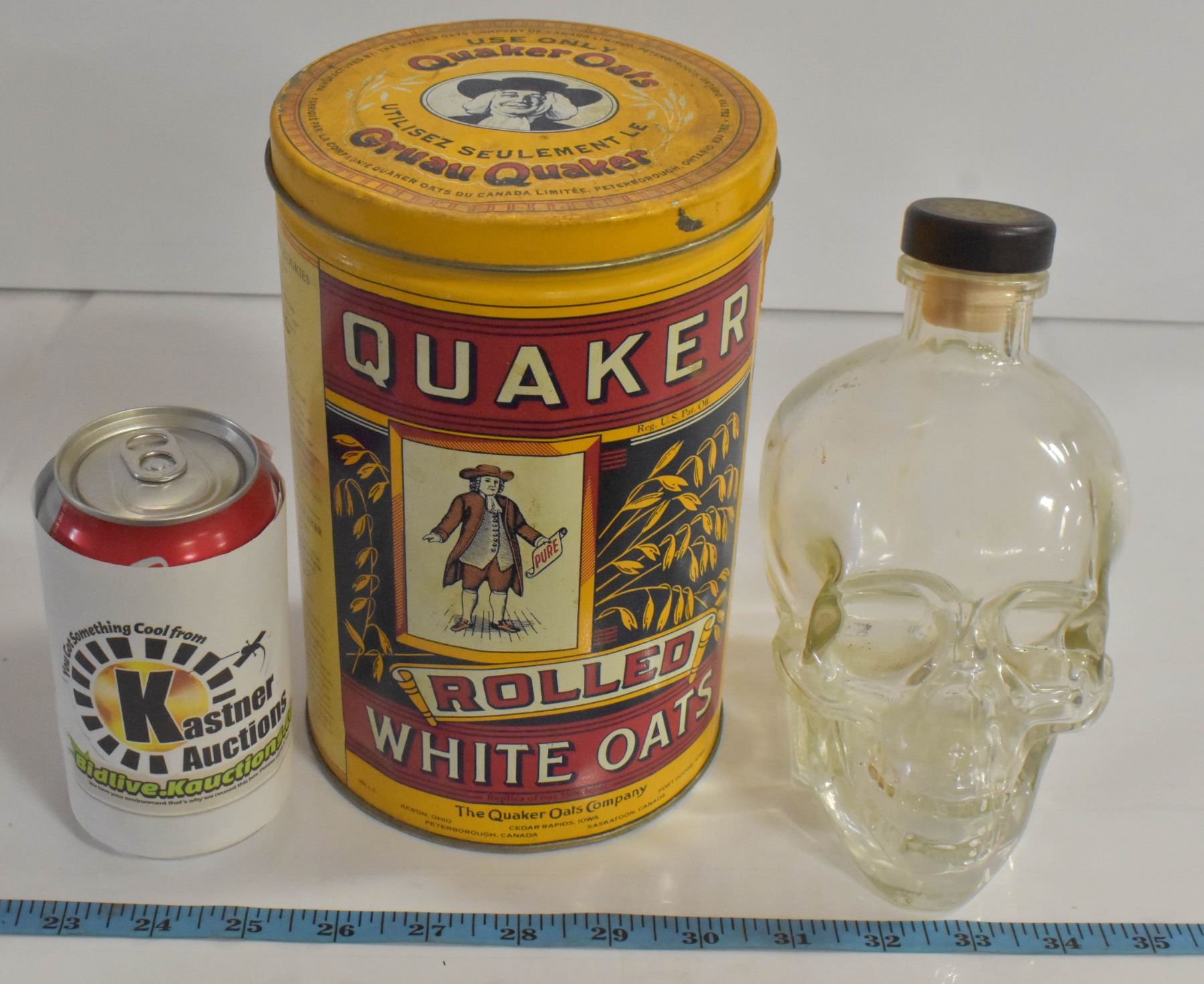VINTAGE QUAKER OATS TIN, SKULL BOTTLE