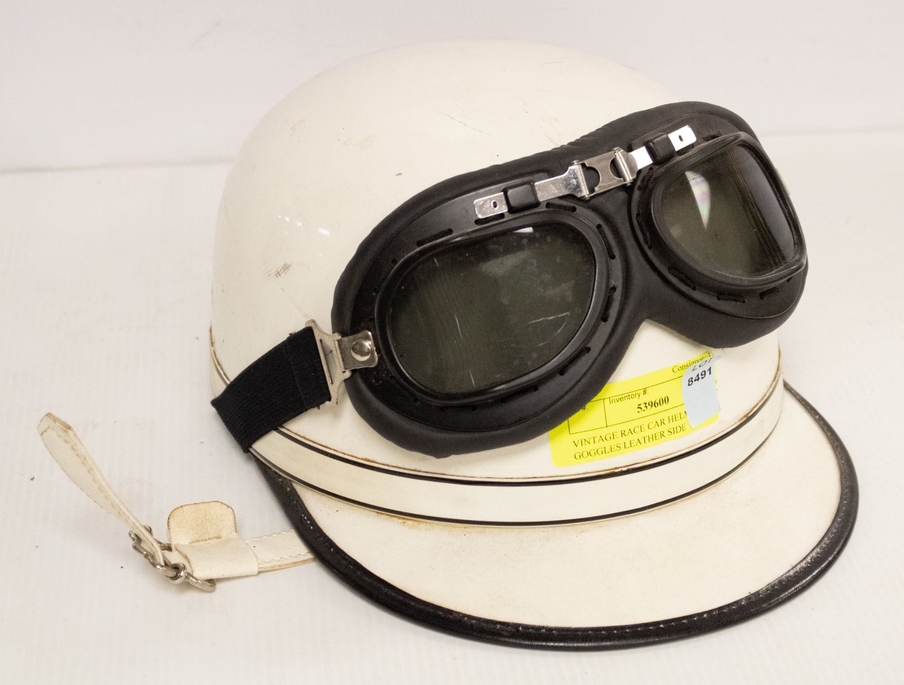 VINTAGE RACE CAR HELMET W GOGGLES LEATHER SIDE