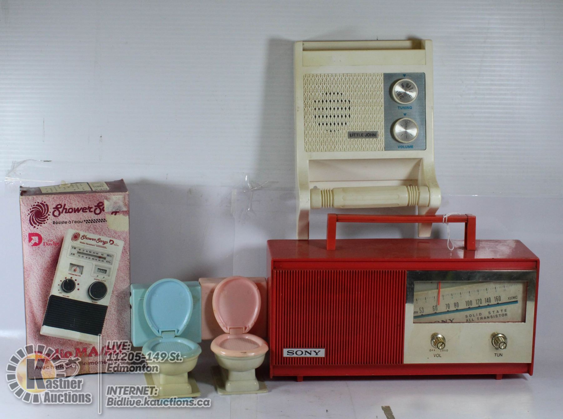BLUE AND PINK TOLIETS, SHOWER, TOLIET HOLDER RADIO