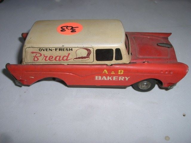 VINTAGE *RARE* CAR TIN TOY STAMPED *JAPAN* LOGOS ARE A & B BAKERY-OVEN FRESH BREAD. TOY IS MISSING REAR WHEELS!! TOY CAME OUT OF SAFE!! ***Coin, Currency & All Items Listed in this auction - Grades, Conditions and Values are not Safe Deposit Coins LLC Responsibilty. Grades, Condition and Values are determined by Consigner(s) & Buyers