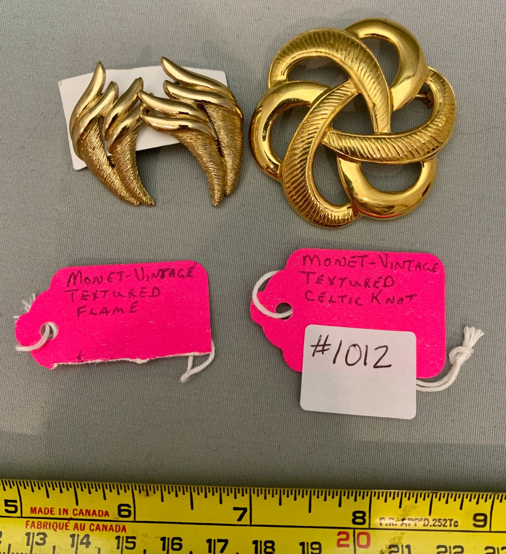 VINTAGE RARE MONET MARKED GOLD TONE CELTIC KNOT BROOK + FLAME TEXTURED EARRINGS SET