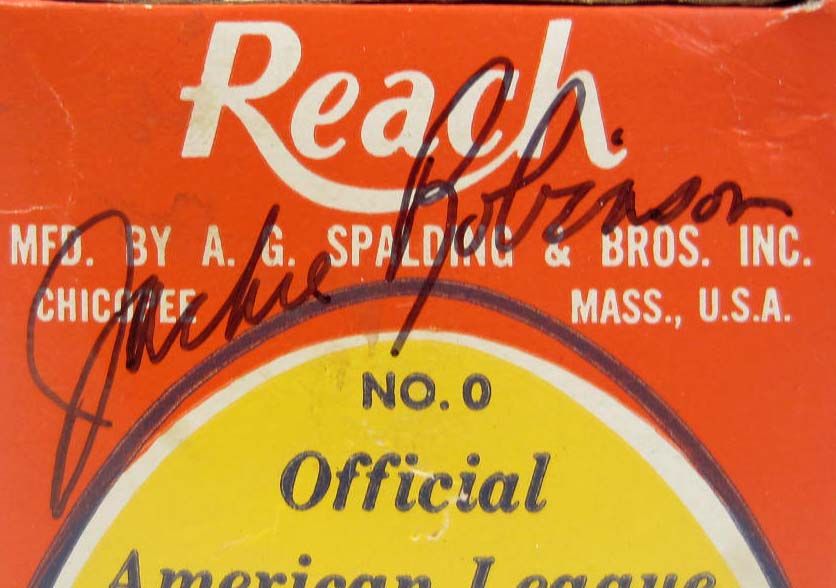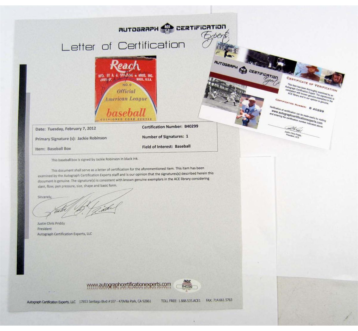 Baseball box signed by Jackie Robinson in black ink. COA from Ace Autograph Certification.