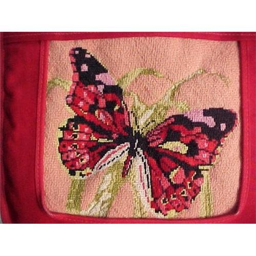 Vintage fashion tote bag with needlepoint hand-embroidered butterfly on leaves, never-used mint like new, a stunning fashion accessory for purse, handbag, or tote bag. Made of heavy brilliant red canvas denim cloth with stitched-in front petitpoint panel in vivid colors of peach, black ,ivory, varying shades of scarlet and pink, varying shades of leaf green, some lavender. This beautiful tote has strong snap for closure, inside has stitched-in zipper pouch. Original maker's label inside: Totepoint by Tony Totes of Vermont Inc. 13Wx10Hx 3". Handles have a 6 1/2" drop, top of straps to bottom 16". Corners of opening covered with brass to avoid fraying. Wonderful gift for yourself or good friend. Shipping in US $9.00
