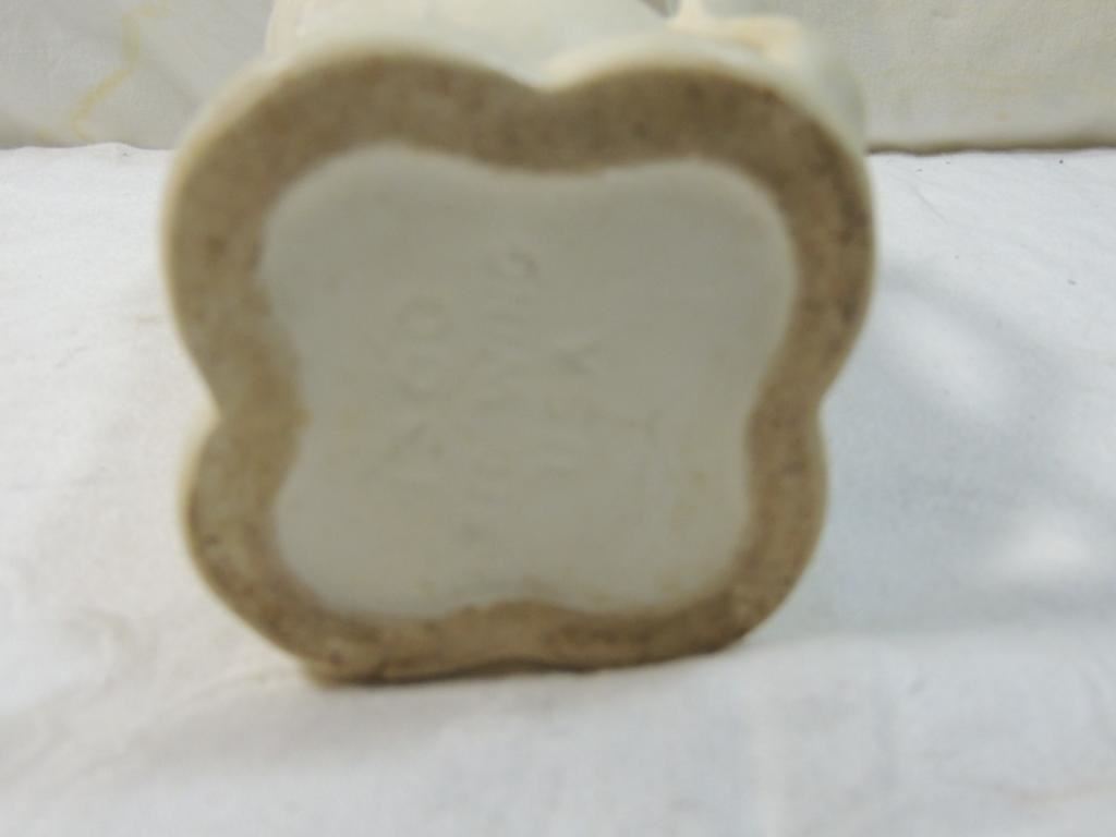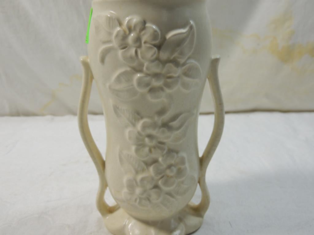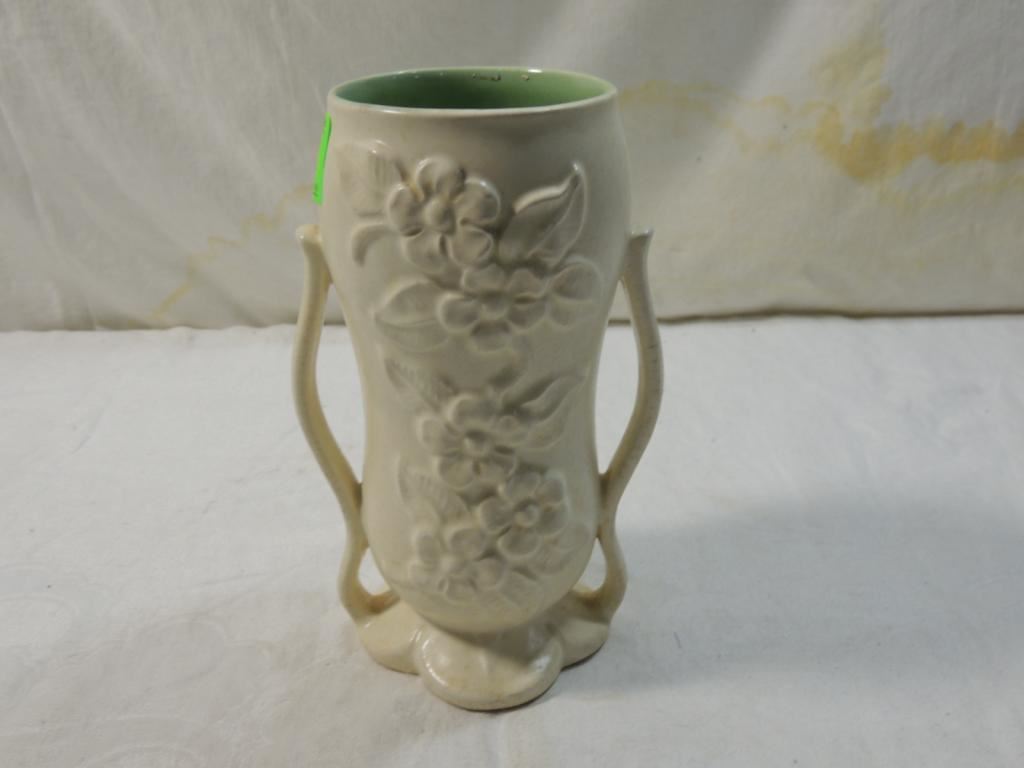 VINTAGE RED WING POTTERY VASE DOUBLE HANDLE FLOWER DETAILS. VASE GREEN AND CREAM AS SHOWN SEE PHOTO FOR MORE DETAILS