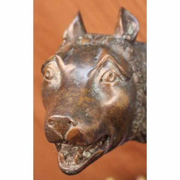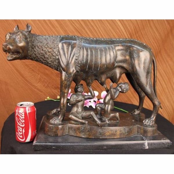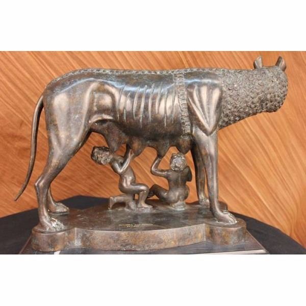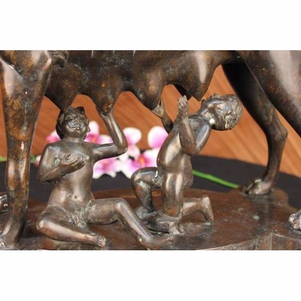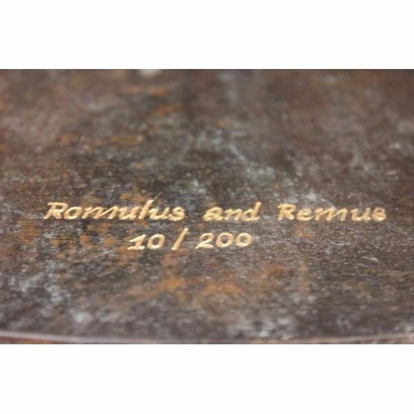 The statue itself is a two toned patina, dark and with an antique rustic green accentuating the detail and mimicking an aged effect. It is of she-wolf in a standing position over the twin brothers, Romulus and Remus. She stands firm and has intricate detailing of a thicker mane around her neck and down her spine. Her ribs are accentuated and her ears are upright. She protects the boys with her body and shields them from harm. Underneath are Romulus and Ramus. One boy sit's with his palms up under her breasts, his mouth just under her nipple. The other kneels and also has his palms facing upwards. They both seem to rejoice in the fact that they are being given nourishment. The sculpture rests on a square slab of bronze and is engraved in gold with the words Romulus and Remus. It is made using the "Lost Wax Method" and is a two tone patina and this is a numbered limited Edition Sculpture. Condition: This sculpture is in perfect condition. Bronze Dimensions with Marble Base:Height 15 1/2" x Width 23" Marble Dimensions: 17 " X 10" Height without base: 14 1/2" Weight : 40 LBS Inventory : 31-56268M13213