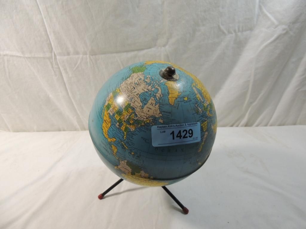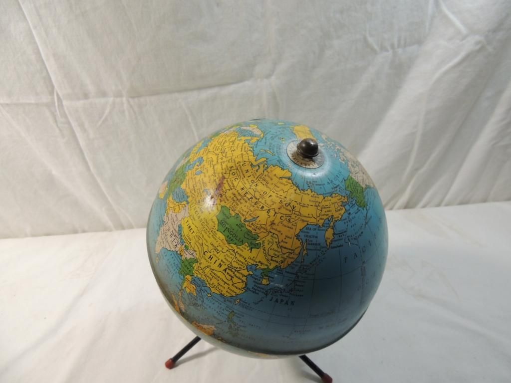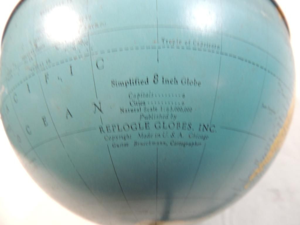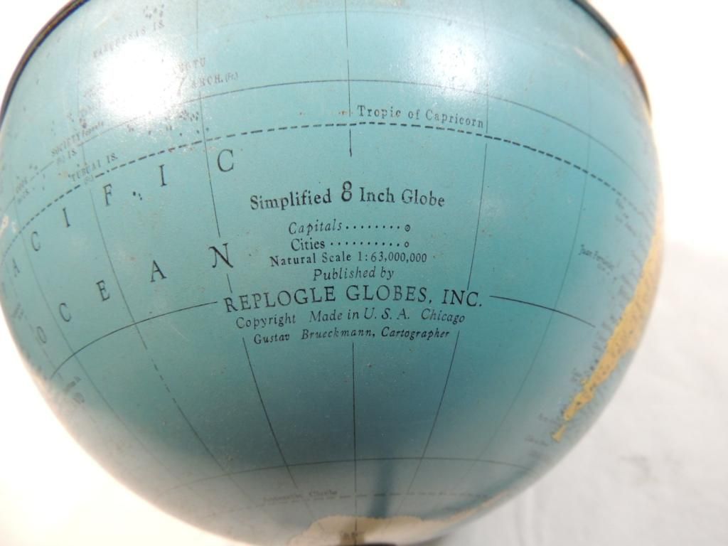 SIMPLIFIED 8 INCH GLOBE VINTAGE REPLOGLE METAL GLOBE ON STAND AS SHOWN SEE PHOTO FOR MORE DETAILS.