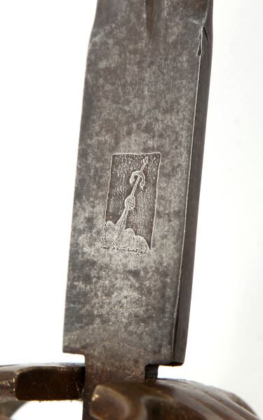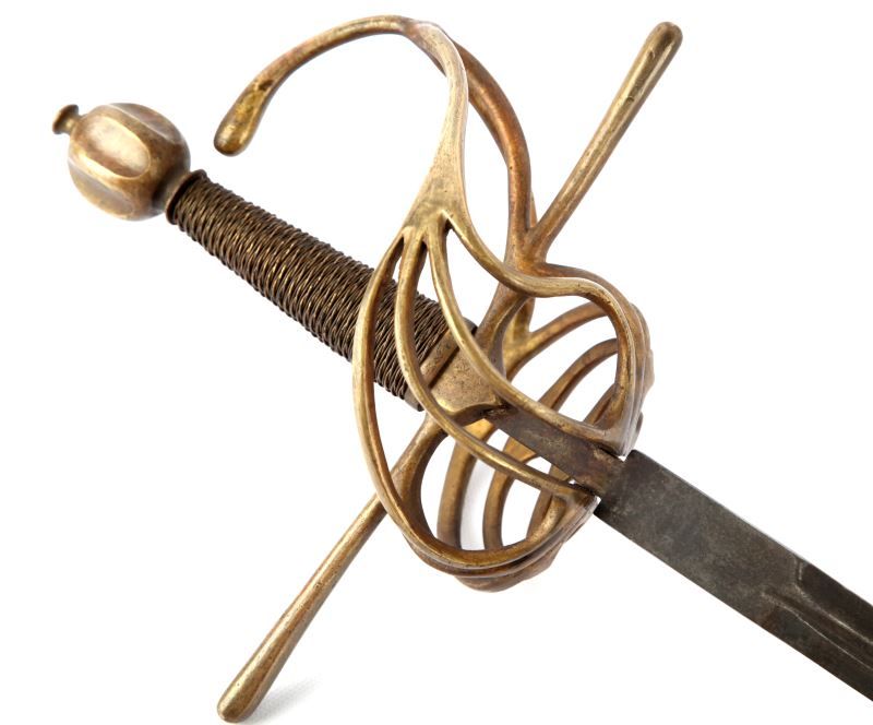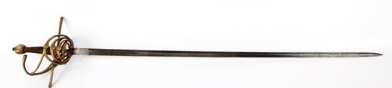 Vintage reproduction of a 16th century Italian swept hilt style rapier sword. 37.5 inch straight blade, with brass hilt, and wire wrapped grip. Dark patina on blade. No scabbard. Small logo visible in ricasso, with what appears to be a faded makers mark on opposite side. Overall very good condition. This lot has a reserve.