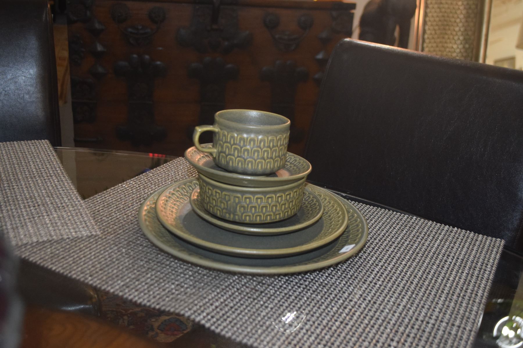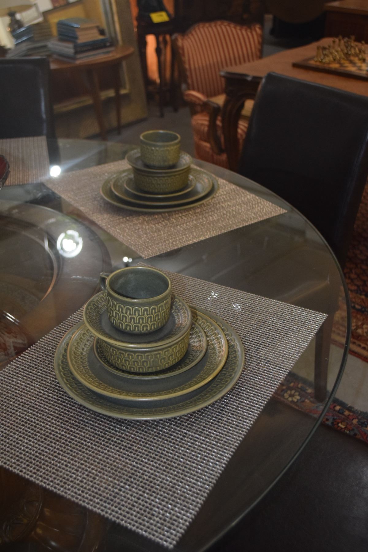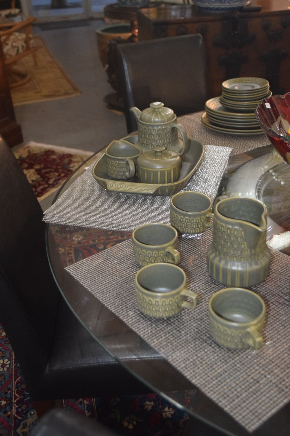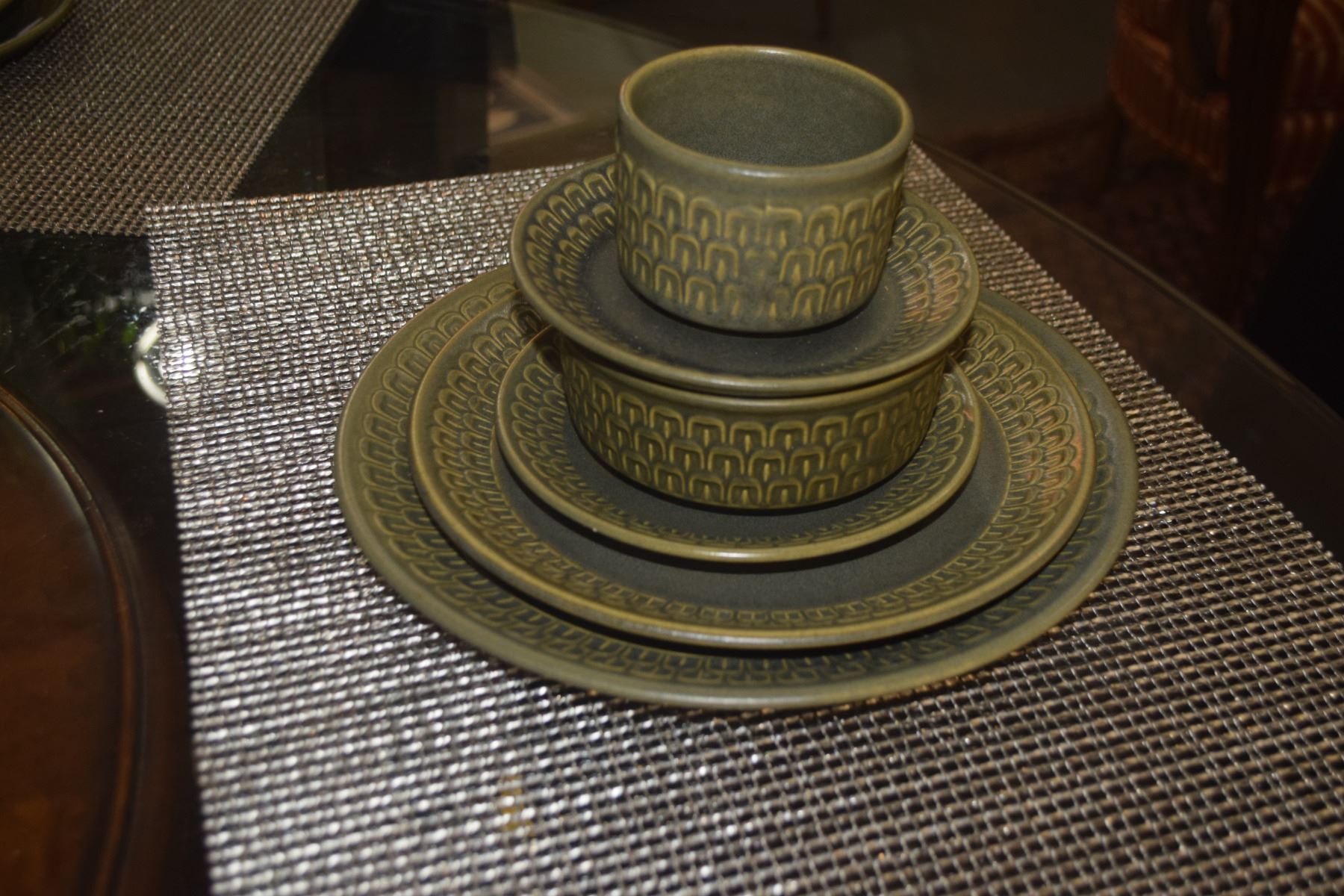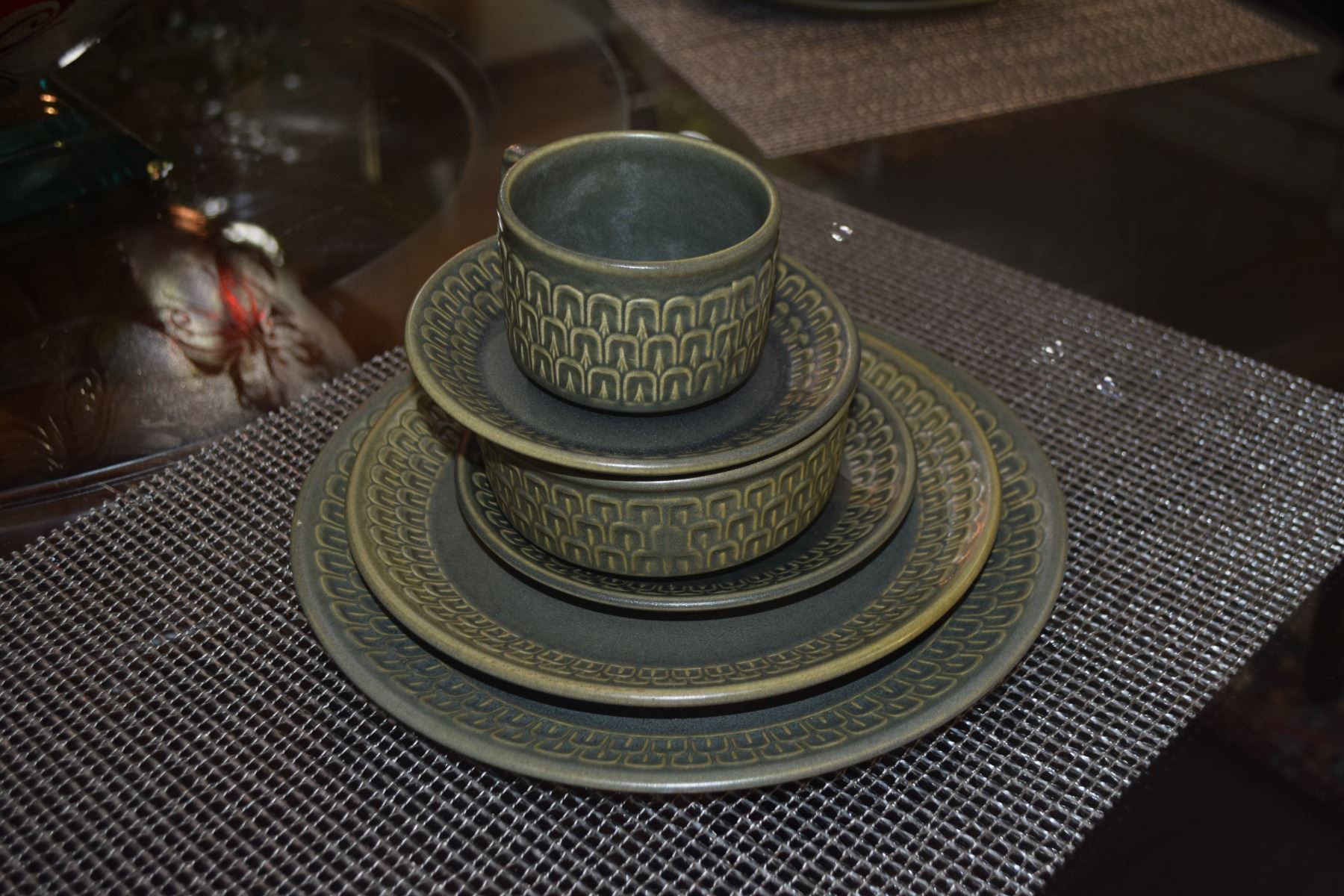 VINTAGE RETRO WEDGWOOD CAMBRIAN GREEN STONEWARE DISHES, CUPS, COFFEE POT, CREAMER, SUGAR & SERVING PIECES (44 PCS)