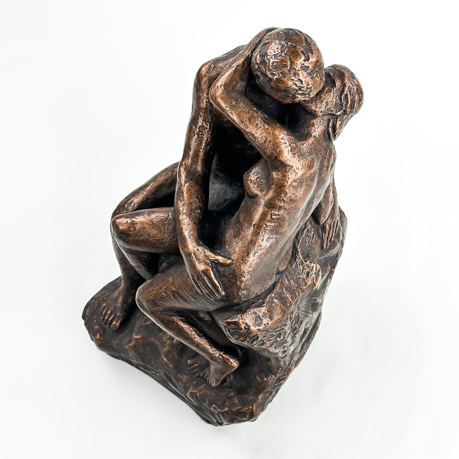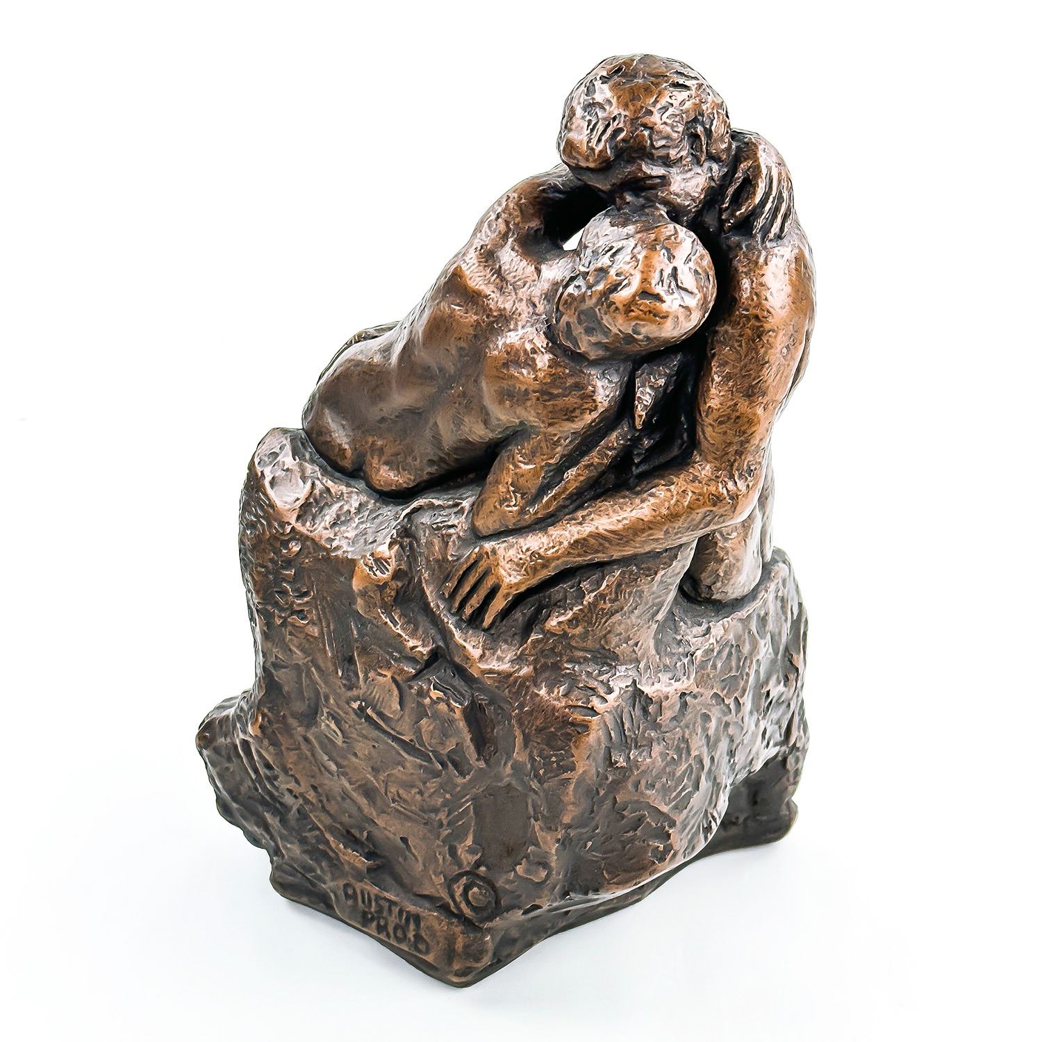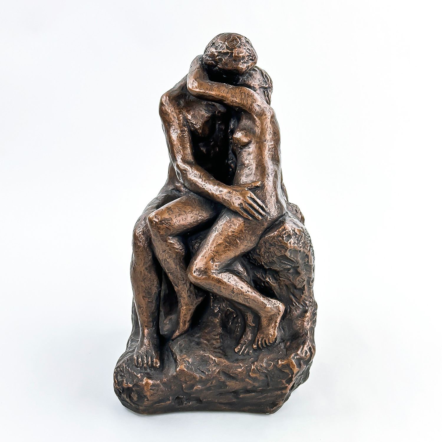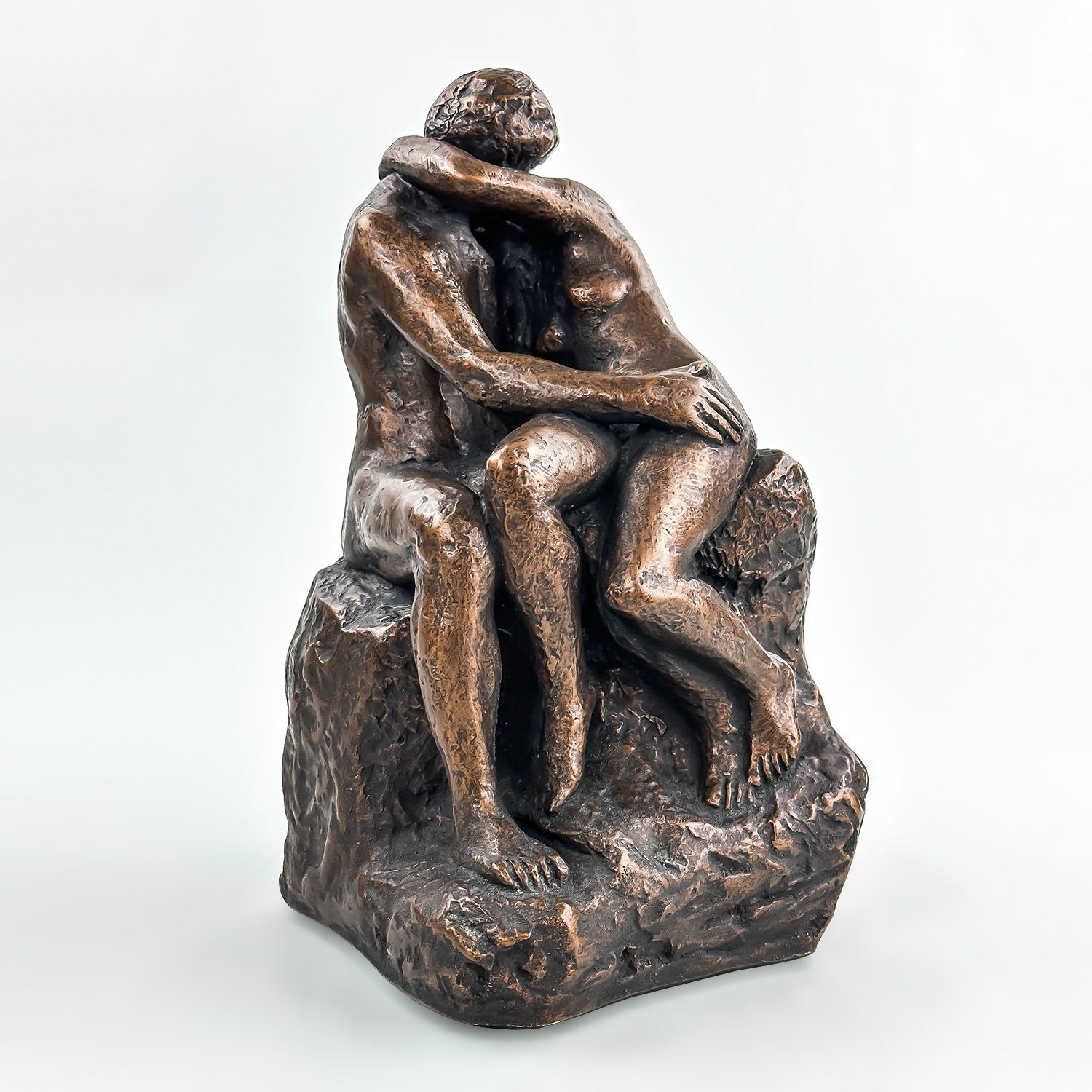 #8031 - NUDE 70’S ERA KISSING COUPLE BY AUSTIN PRODUCTIONS. BRUSHED BRONZE CHALKWARE ART SCULPTURE RODIN’S ‘THE KISS’. EXCELLENT VINTAGE CONDITION WITH NO CRACKS, CHIPS OR REPAIRS. HOME OR OFFICE DECOR. MEASURES: 10.25” (26 CM) TALL BY 6” (15 CM) WIDE AND 6” (15 CM) DEEP