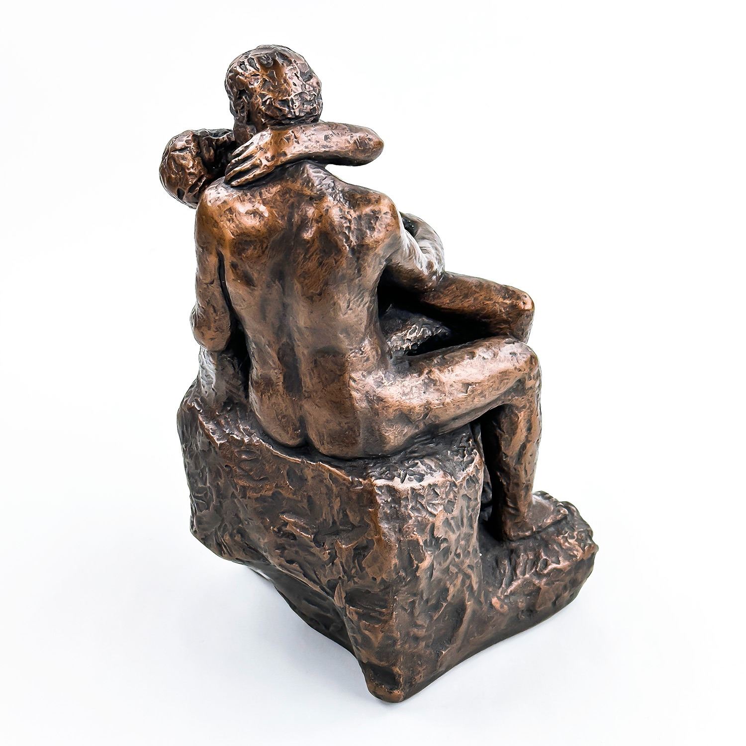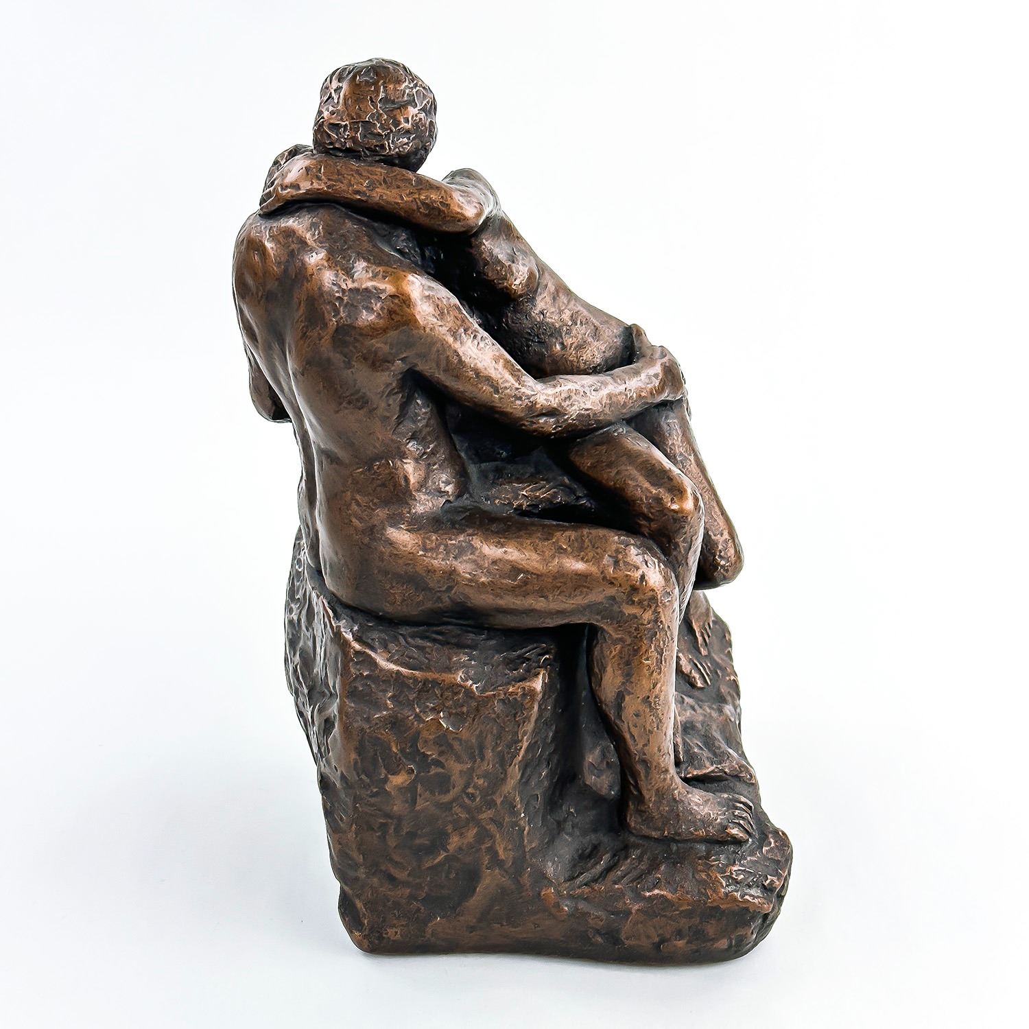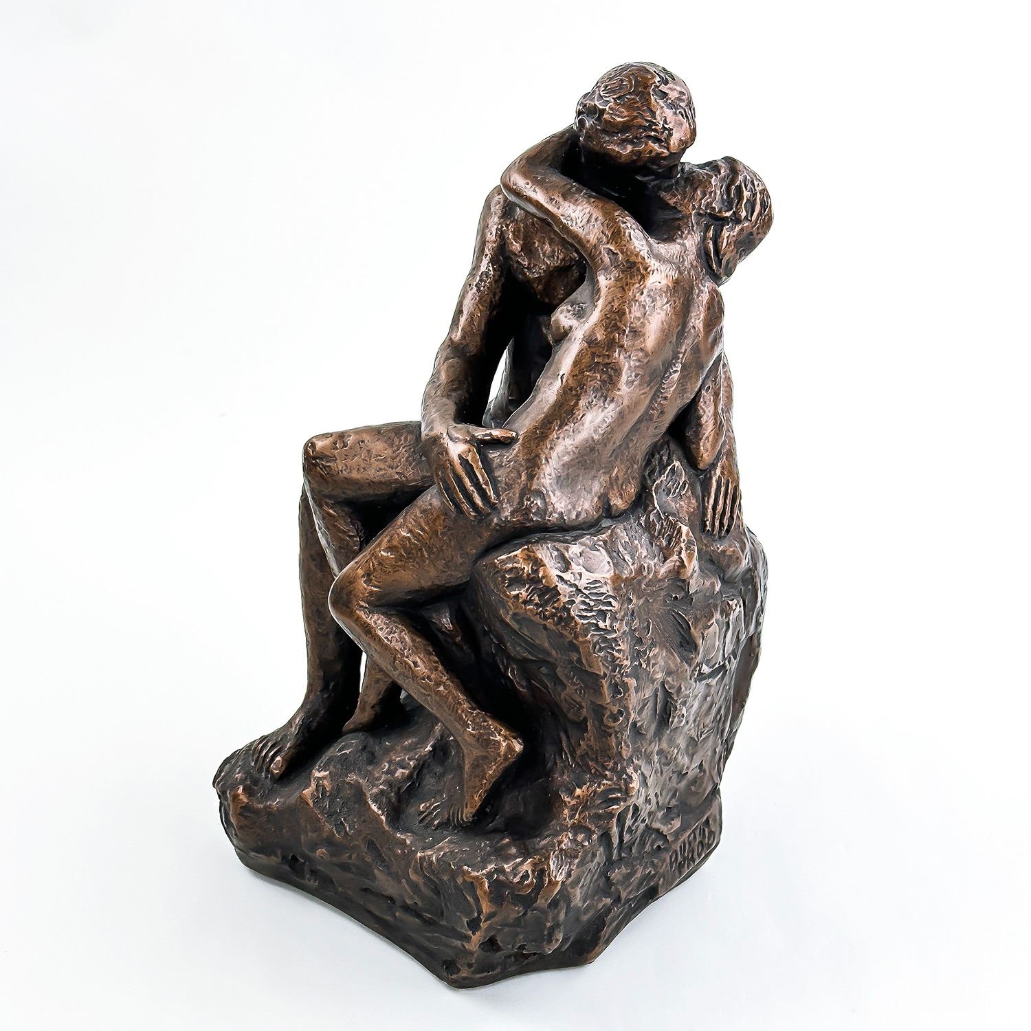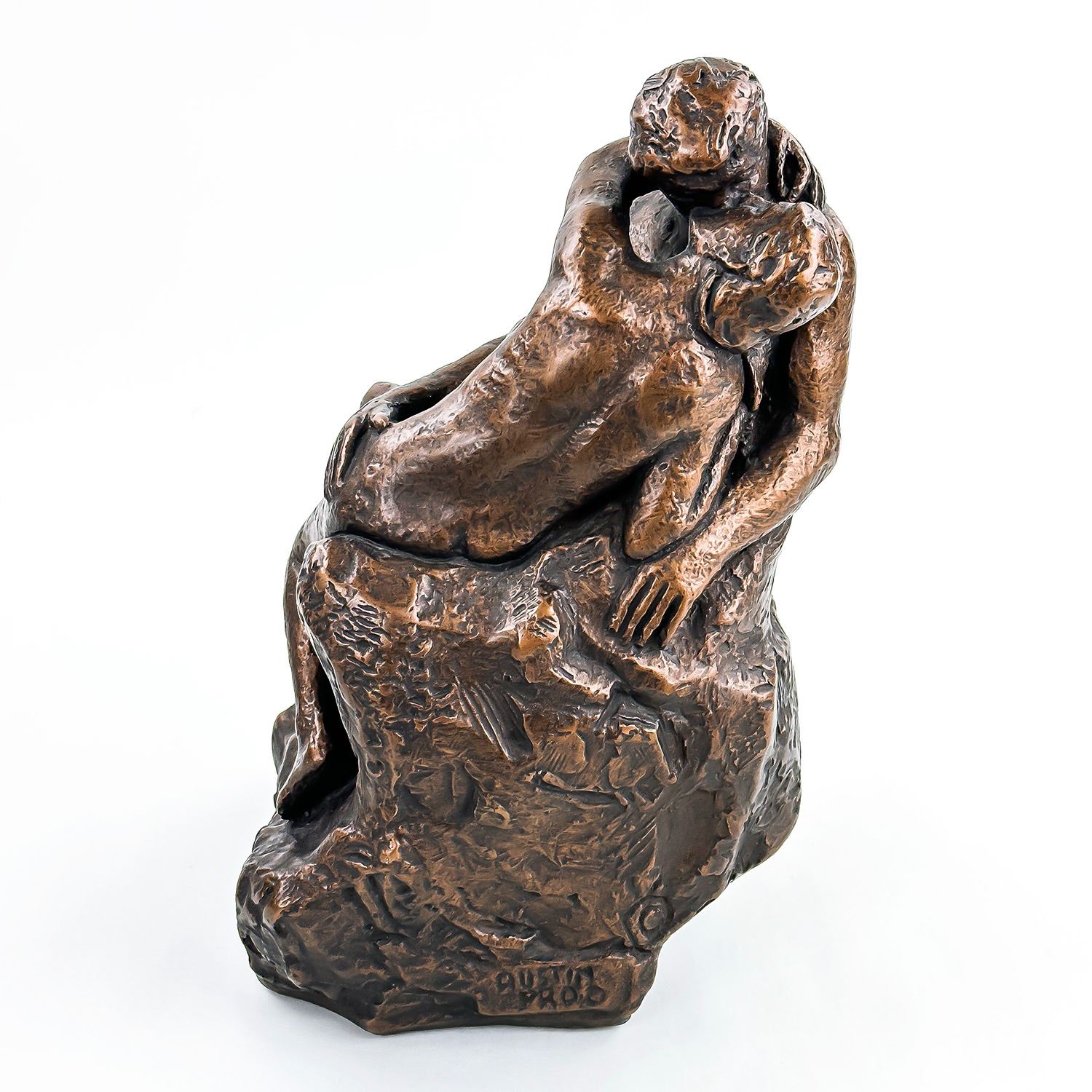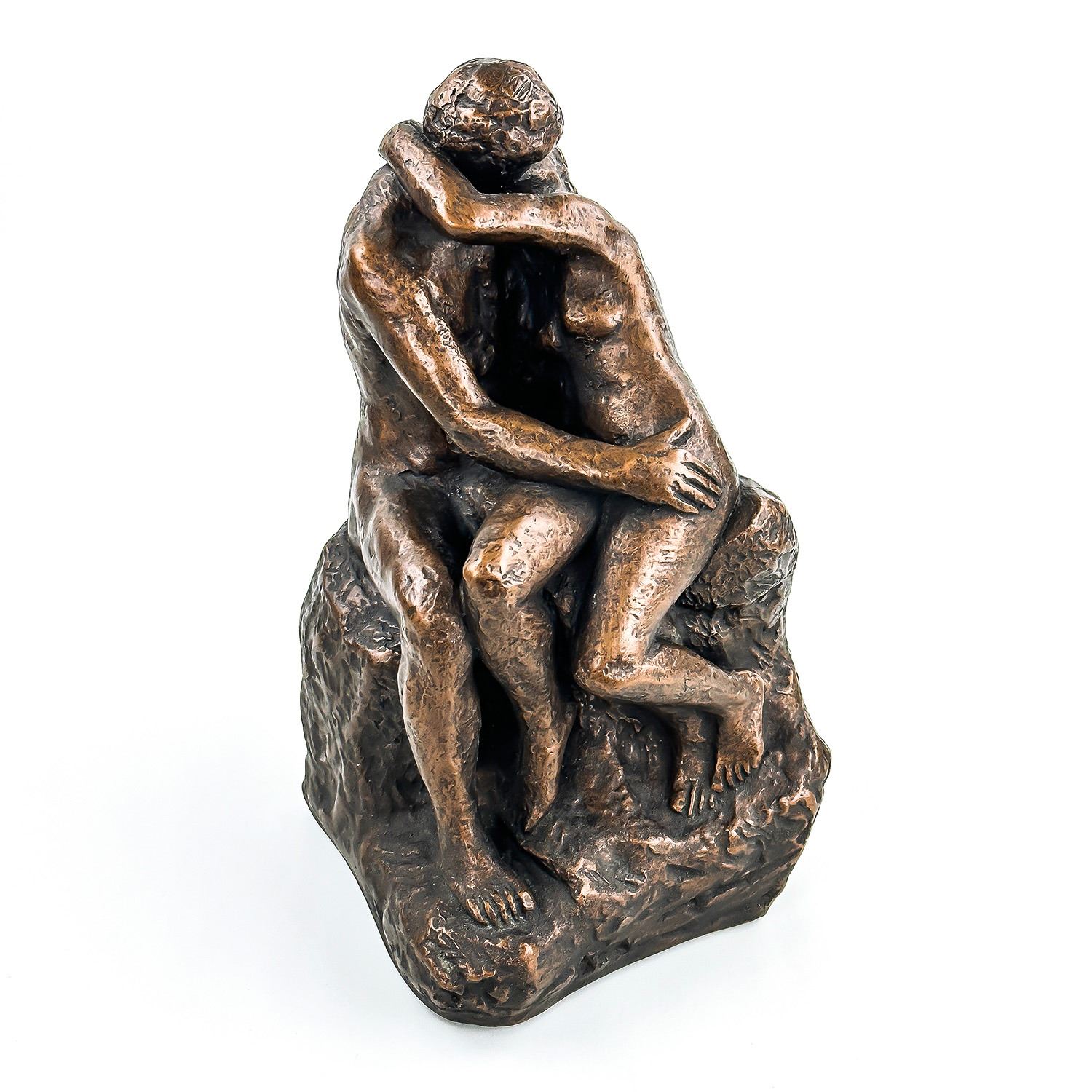 #8031 - NUDE 70’S ERA KISSING COUPLE BY AUSTIN PRODUCTIONS. BRUSHED BRONZE CHALKWARE ART SCULPTURE RODIN’S ‘THE KISS’. EXCELLENT VINTAGE CONDITION WITH NO CRACKS, CHIPS OR REPAIRS. HOME OR OFFICE DECOR. MEASURES: 10.25” (26 CM) TALL BY 6” (15 CM) WIDE AND 6” (15 CM) DEEP
