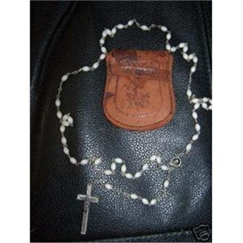 Vintage White Rosary Beads from the 1950's-1960's in tooled brown leather pouch/case. <p> Case has some very nice tooling engraved into it.  Case has some staining on front & back & seam on the right side is opened up & needs to be stitched back down.  Rosaries are white & cross is white with silver-tone backing, Cross is stamped in back Made in Italy. Please view photo, read description & ask all questions prior to purchase as all sales are final on these Vintage used Rosary Beads, which are about 45+ years old.<p>
