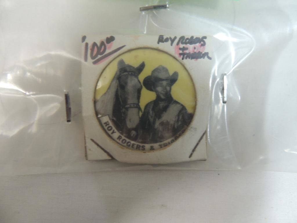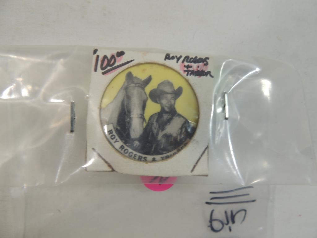 VINTAGE ROY ROGERS AND TRIGGER PIN BUTTON COLLECTIBLE MEMORABILIA VINTAGE GOOD CONDITION AS SHOWN SEE PHOTO FOR MORE DETAILS.